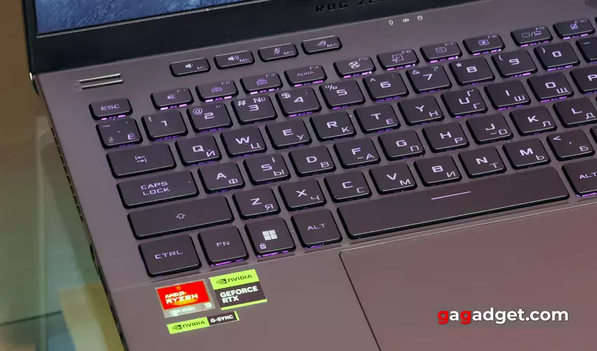Het toetsenbord heeft een single-zone RGB achtergrondverlichting (zonder aparte instelling voor elke toets) met AURA Sync synchronisatie. Alle tekens worden gelijkmatig verlicht. De volledige travel van de toetsen is 1,7 mm. Het toetsenbord is comfortabel, de toetsen hebben een gematigd zachte informatieve aanslag en het is handig in gebruik.