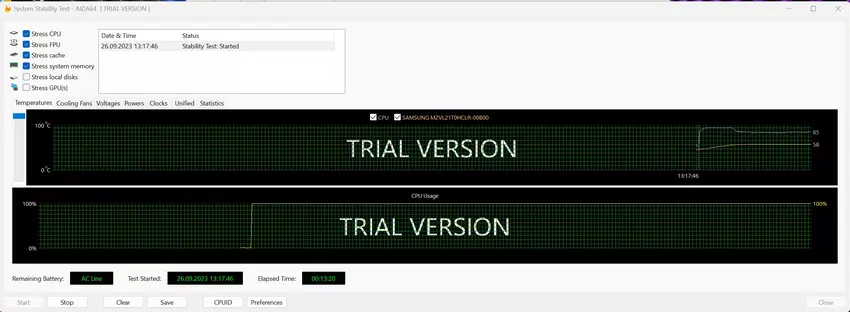 Tijdens de stresstest in AIDA64 warmen de componenten aanvankelijk op tot ongeveer 95°. Nadat het koelsysteem zich heeft aangepast, blijft de temperatuur rond de 85°. Er is geen throttling waargenomen en het systeem werkt stabiel. Op maximale snelheid is het koelsysteem behoorlijk luid, hoewel het geluidsniveau lager is dan bij grotere gaming modellen. De behuizing warmt voornamelijk op boven het toetsenbord, wat geen ongemak veroorzaakt tijdens het gebruik.