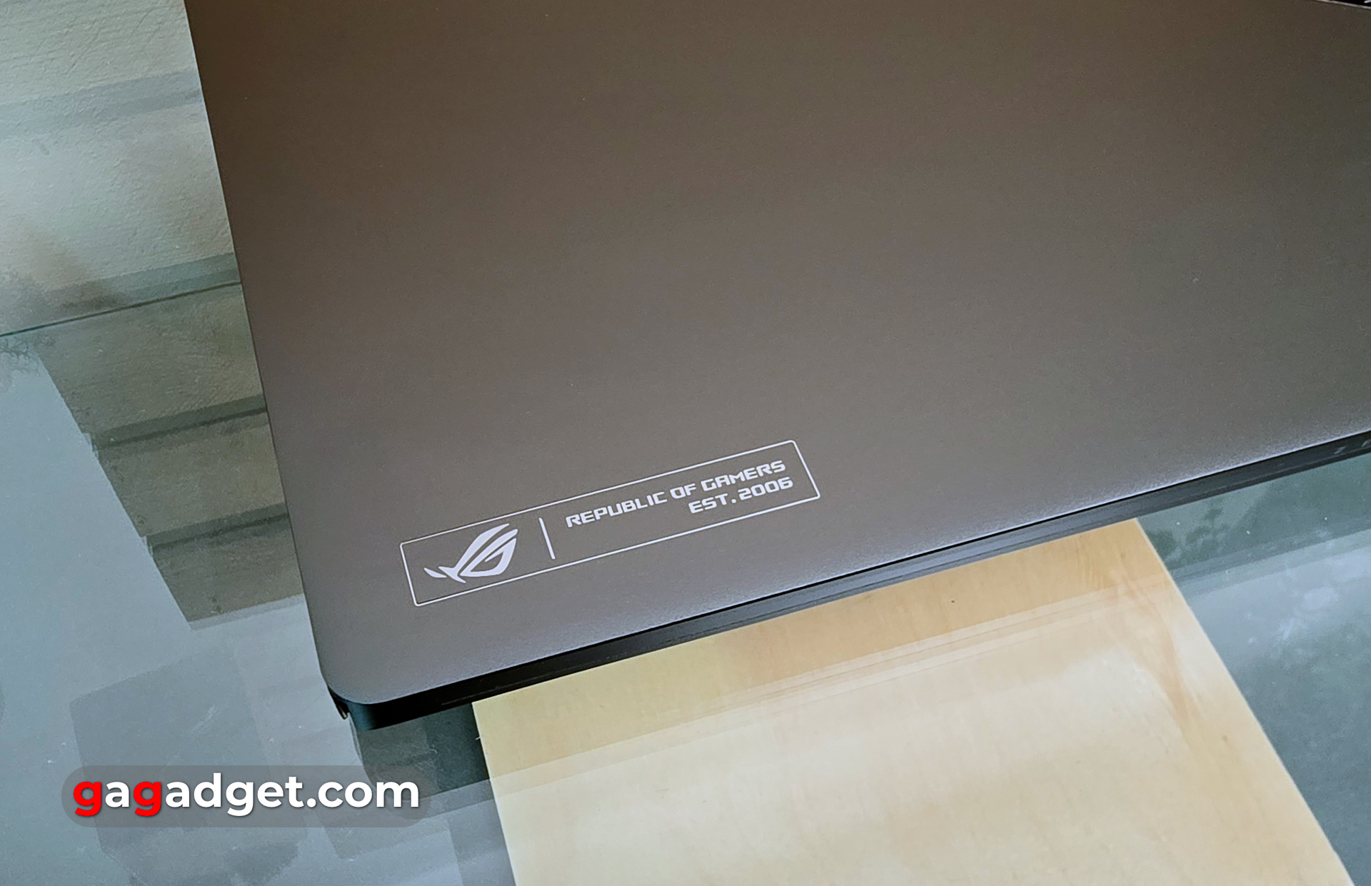 Alle oppervlakken van de laptop hebben een aangename matte textuur en verzamelen nauwelijks vingerafdrukken of vuil. Op de bovenklep staat een klein logo van de ROG gaming lijn, evenals een nieuw decoratief element voor de lijn - Slash Lightning. Dit is een diagonale LED-strip met 7 zones die verschillende effecten kan weergeven, afhankelijk van de instellingen. Ik heb een donkergrijze versie bekeken. Hoewel er naar mijn mening ook een interessantere witte versie is.