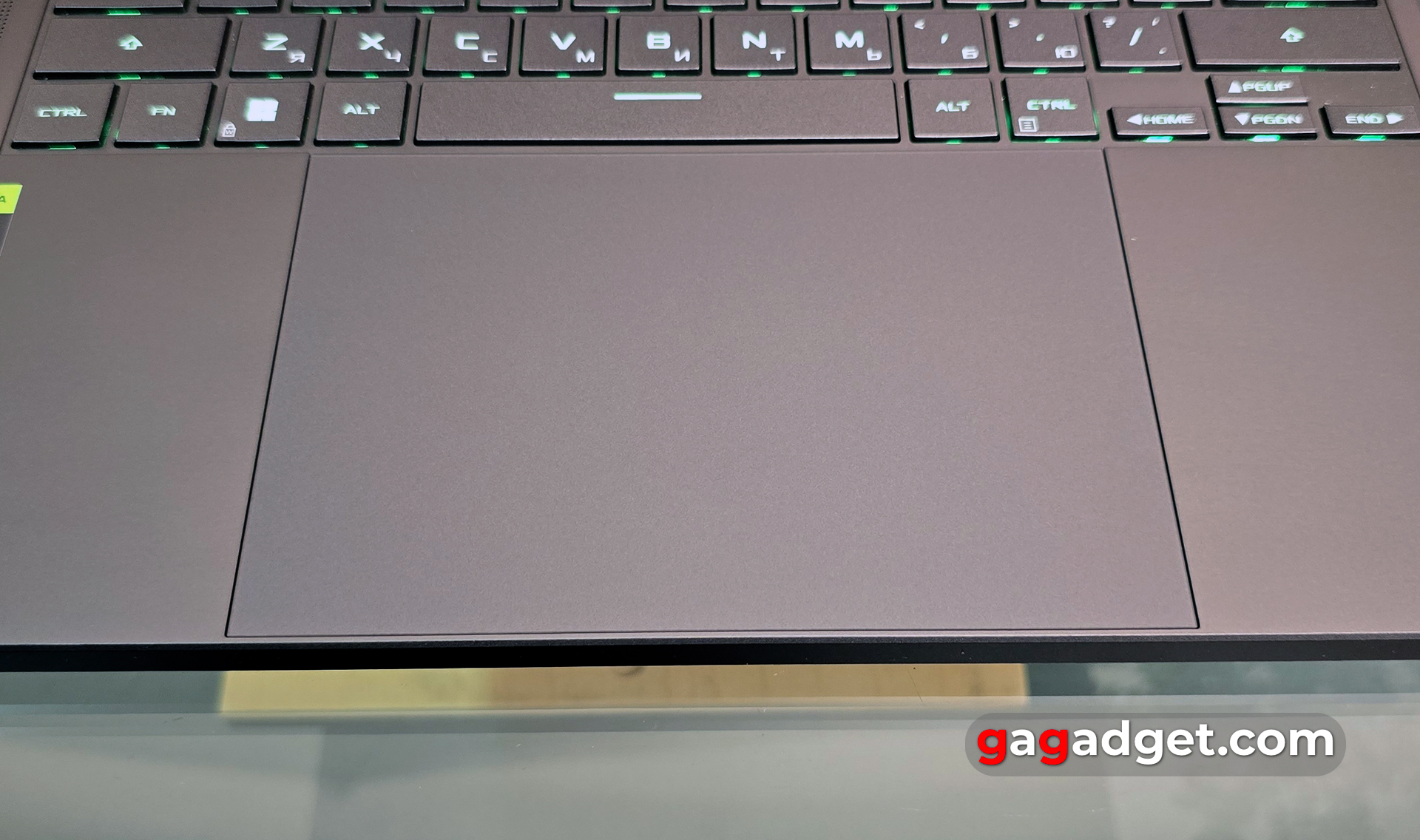 Het touchpad van de laptop is apart het vermelden waard. Het is enorm, meet 150,3 x 98,8 mm en heeft een glazen coating. De gevoeligheid en positioneringsnauwkeurigheid zijn uitstekend. Natuurlijk kun je alleen turn-based strategieën of RPG's spelen op het touchpad. Maar voor alles behalve gamen is het touchpad absoluut voldoende.