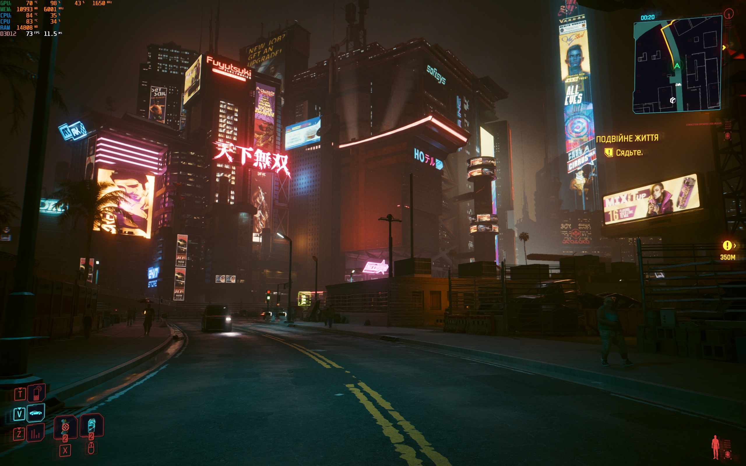 - Cyberpunk 2077. Maximale instellingen, inclusief path tracing. DLSS in automatische modus met framegeneratie. 65-75 FPS