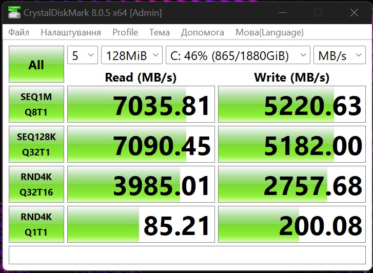 De schijf heeft de verwachte hoge snelheid. Tot 7100 MB/s bij het lezen van gegevens en ongeveer 5200 MB/s bij het schrijven.