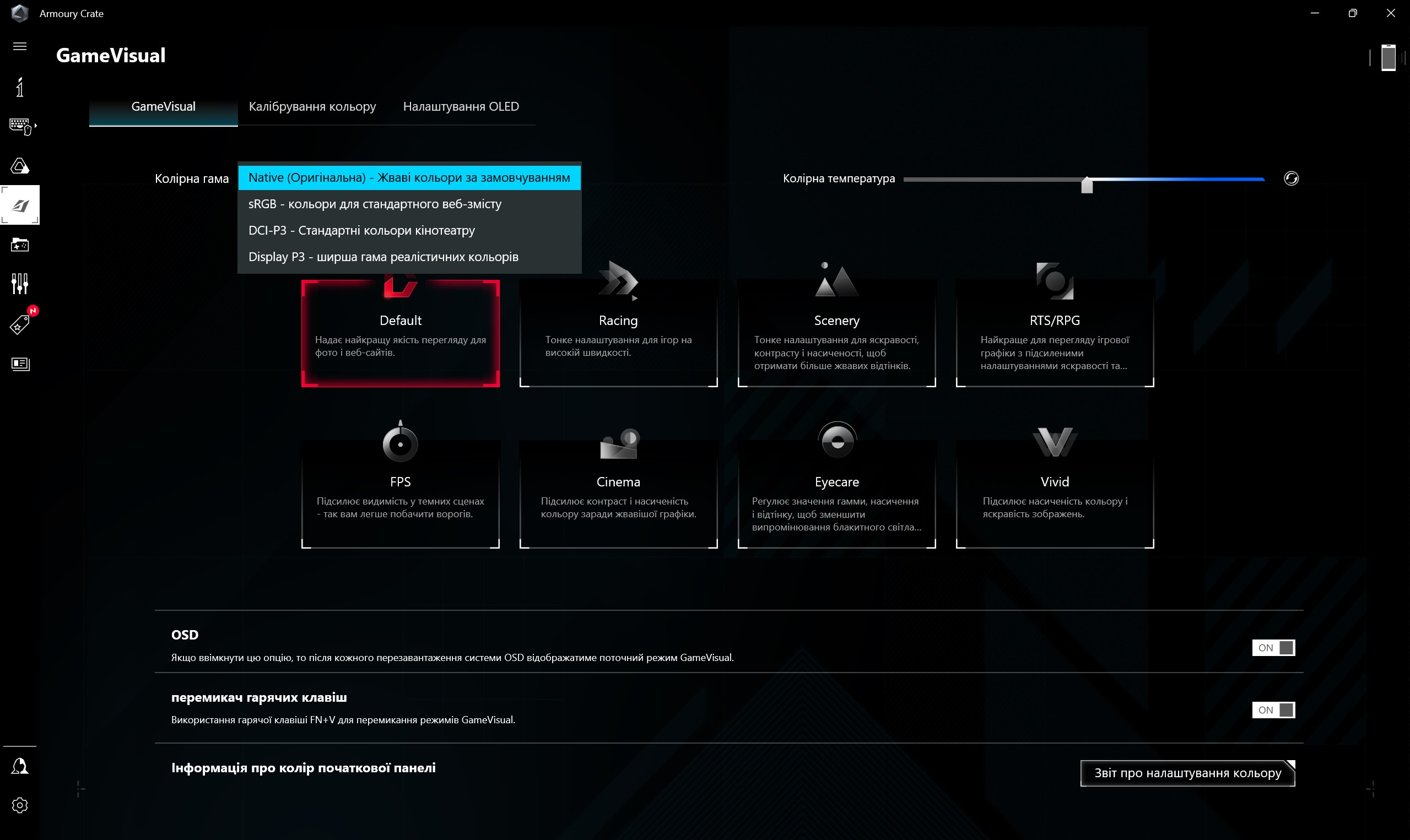 OLED-schermen hebben hun weg gevonden naar gaming laptops. De ASUS ROG Zephyrus G16 (2024) heeft een 16-inch OLED-scherm . Het heeft een resolutie van WQXGA (2560 x 1600) en een beeldverhouding van 16:10. Er wordt beweerd dat het kleurengamma goed is. Er wordt beweerd dat het kleurengamma 100% van de DCI-P3-ruimteis, de vernieuwingsfrequentie 240 Hz en de reactietijd 0,2 ms. Er wordt een piekhelderheid van 500 cd/m² in HDR-modus beloofd. Er is ondersteuning voor de HDR Dolby Vision standaard, Pantone certificering, VESA DisplayHDR True Black 500 en G-Sync frameratesynchronisatie. Het scherm is bedekt met beschermend glas, wat voor sommige mensen niet geschikt is vanwege de aanwezigheid van schittering. De ROG Armoury Crate app heeft, naast de gebruikelijke Game Visual modi, keuze uit kleurengamma (DCI-P3, sRGB, etc.), kleurtemperatuurinstellingen en schermkalibratie. En er is een apart gedeelte voor OLED-instellingen. Het heeft aparte functies om pixelinbranding te voorkomen, de zogenaamde doelmodus (het actieve venster blijft ongewijzigd, alle andere gebieden worden gearceerd) en een functie om flikkeren te verminderen wanneer de helderheid wordt verlaagd.