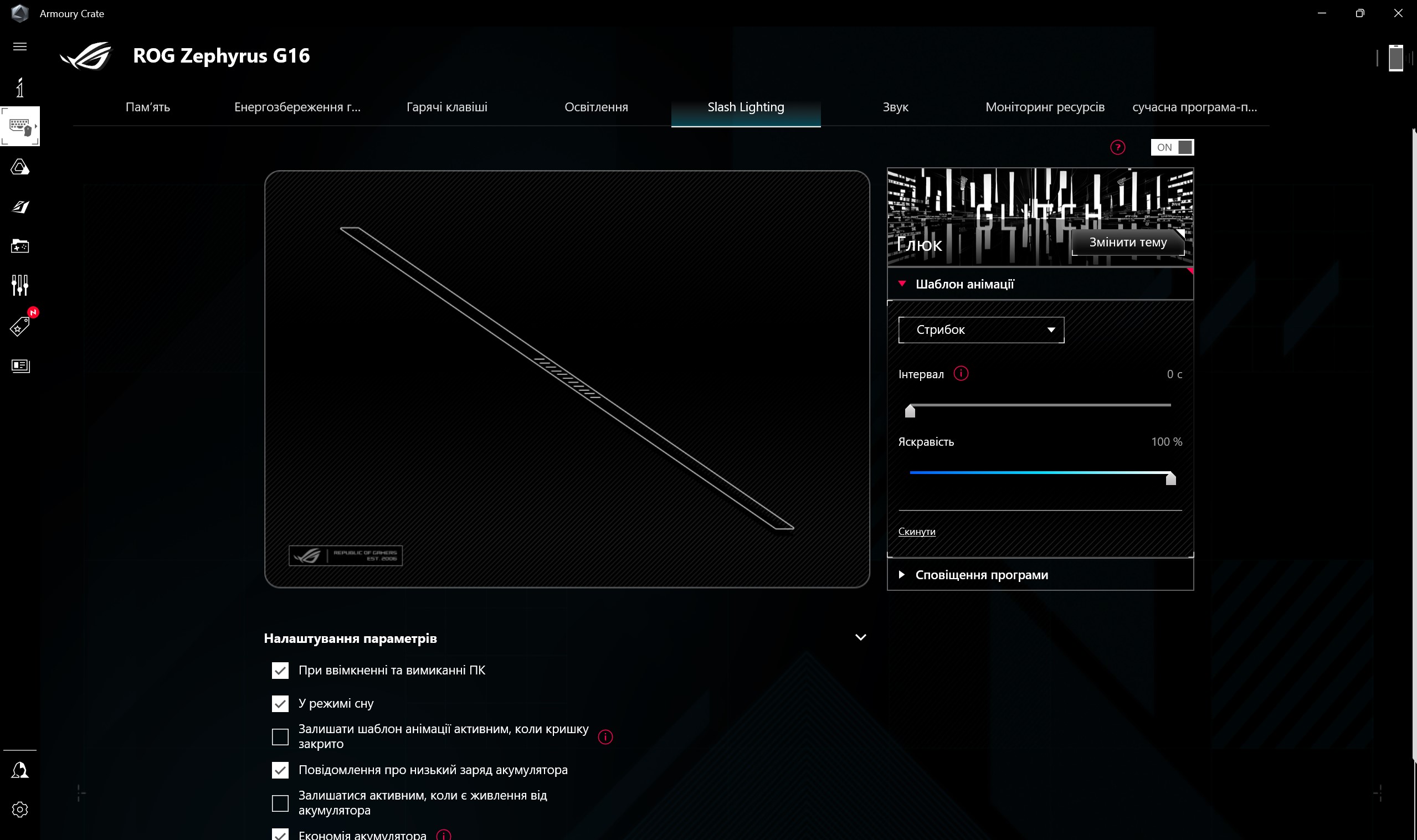 Alles is standaard met de software. De belangrijkste toepassing is ROG Armoury Crate, die alle benodigde instellingen bevat. We hebben het er al vaak over gehad. Wat nieuw is, is de eerder genoemde OLED-instellingssectie en de Slash Lightning instellingen voor de achtergrondverlichting.