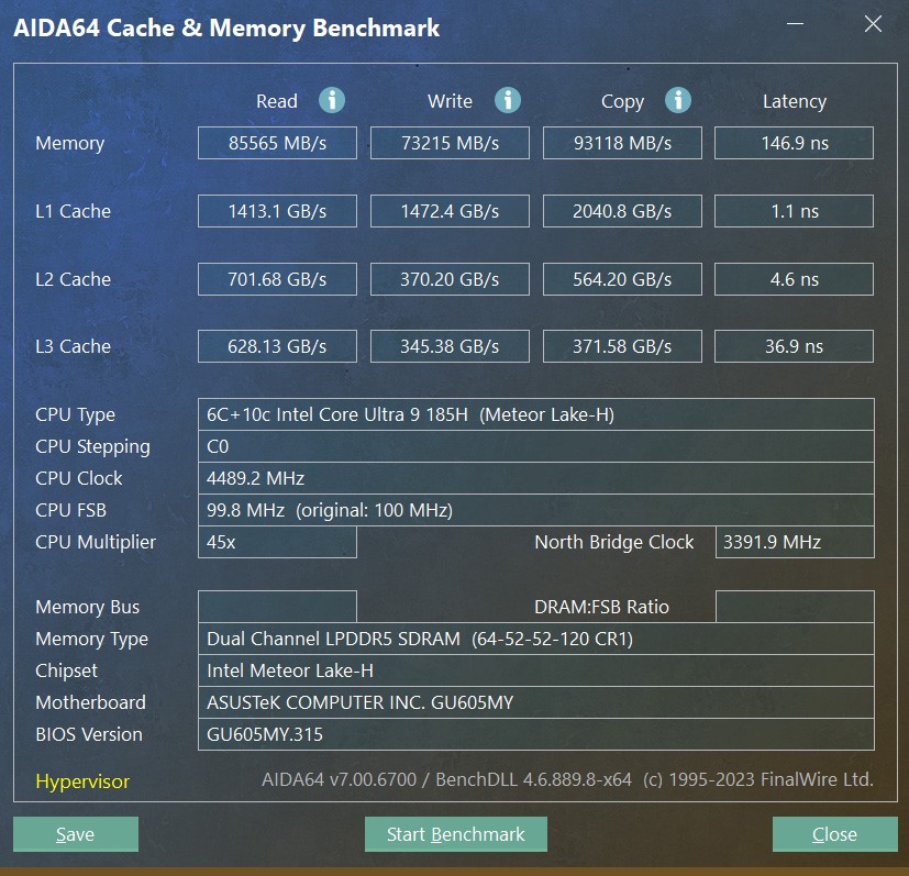 | Processor | Intel Core Ultra 9 185H (tot 5,1 GHz), 16 (6+8+2) kernen, 22 threads, (Meteor Lake) |