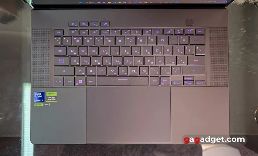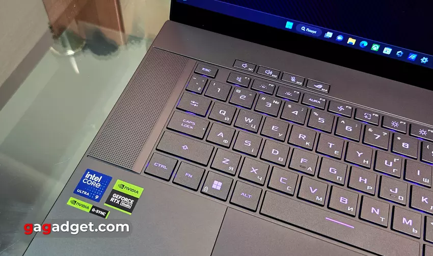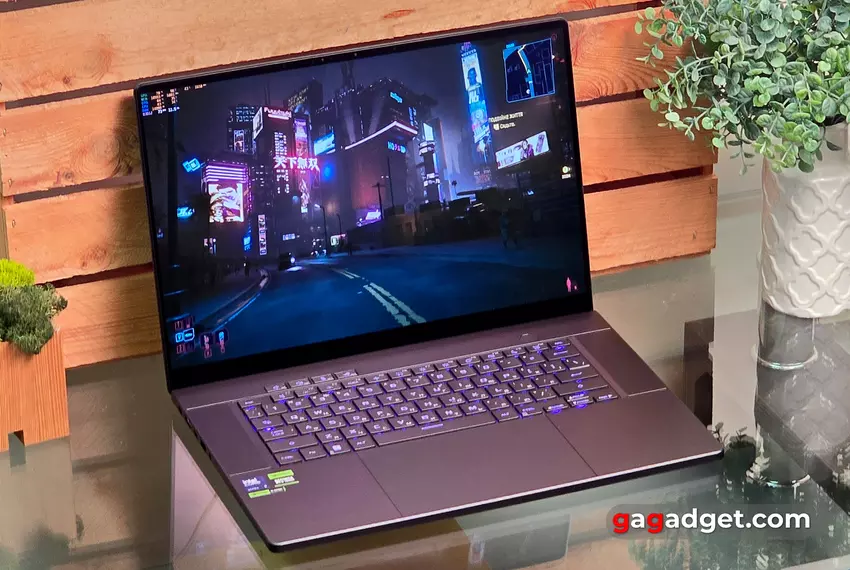 Laten we het nu hebben over de componenten en prestaties van de ASUS ROG Zephyrus G16 (2024). Zoals hierboven vermeld, dwong de dunne en lichte behuizing het bedrijf om enkele compromissen te sluiten. Dit geldt zowel voor de processor als de videokaart. Gewoonlijk worden moderne top gaming modellen aangedreven door krachtige Intel 14e generatie HX serie processors. In ons geval gebruiken we de nieuwe Intel Core Ultra van de Meteor Lakefamilie, namelijk Intel Core Ultra 9 185H, die we onlangs hebben besproken in onze review van de ASUS Zenbook 14 OLED ultraportable laptop (UX3405). Ter herinnering: de processor heeft nieuwe ingebouwde graphics op basis van de Arc-architectuur, evenals een aparte neuroprocessor Intel AI Boost NPU, die moet worden gebruikt voor alle AI- en machine learning-bewerkingen. De processor is vervaardigd met behulp van Intel's procestechnologie 4 (7 nm) en heeft in totaal 16 kernen. 6 productieve cores die werken op 2,3-5,1 GHz, 8 energiezuinige cores op 1,8-3,8 GHz en 2 ultrazuinige cores op 1-2,5 GHz. Tot 22 rekenhreads worden ondersteund. De Arc grafische versneller heeft 8 Xecores, met een frequentie tot 2,35 GHz. De maximale frequentie van de Intel AI Boost NPU is 1,4 GHz. Het TDP-niveau van de processor is 28-45 W. RAM - 32 GB LPDDR5X 7467 (2x16 GB), werkt in dual-channel modus. Helaas zit het op de kaart, dus uitbreiding of vervanging is niet mogelijk. Draadloze interfaces: Bluetooth 5.3 en snelle Wi-Fi 6E (802.11ax) (triple-band) 2x2. De gebruikte discrete videoaccelerator is de top-of-the-line NVIDIA GeForce RTX 4090 Laptop, maar met een nogal bescheiden TGP-waarde: tot 115W (95W + 20W Dynamic Boost). De frequentie is van tot 1650 MHz en een boost tot 1700 MHz. Ter vergelijking, de GeForce RTX 4090 laptop in de ASUS ROG Strix SCAR 18 (2024) had een standaard TGP-niveau tot 150 W en ROG Boost 175 W. Videogeheugencapaciteit 16 GB GDDR6. De laptop is uitgerust met een MUX Switch multiplexer om de grafische kaart rechtstreeks te verbinden met het beeldscherm om latentie te verminderen en prestaties te verhogen. Hij ondersteunt NVIDIA Advanced Optimus-technologie voor automatisch schakelen tussen MUX-switches.