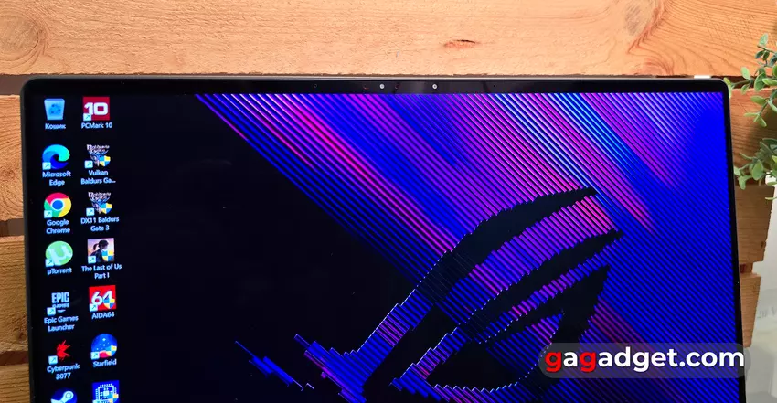 OLED-schermen hebben hun weg gevonden naar gaming laptops. De ASUS ROG Zephyrus G16 (2024) heeft een 16-inch OLED-scherm . Het heeft een resolutie van WQXGA (2560 x 1600) en een beeldverhouding van 16:10. Er wordt beweerd dat het kleurengamma goed is. Er wordt beweerd dat het kleurengamma 100% van de DCI-P3-ruimteis, de vernieuwingsfrequentie 240 Hz en de reactietijd 0,2 ms. Er wordt een piekhelderheid van 500 cd/m² in HDR-modus beloofd. Er is ondersteuning voor de HDR Dolby Vision standaard, Pantone certificering, VESA DisplayHDR True Black 500 en G-Sync frameratesynchronisatie. Het scherm is bedekt met beschermend glas, wat voor sommige mensen niet geschikt is vanwege de aanwezigheid van schittering. De ROG Armoury Crate app heeft, naast de gebruikelijke Game Visual modi, keuze uit kleurengamma (DCI-P3, sRGB, etc.), kleurtemperatuurinstellingen en schermkalibratie. En er is een apart gedeelte voor OLED-instellingen. Het heeft aparte functies om pixelinbranding te voorkomen, de zogenaamde doelmodus (het actieve venster blijft ongewijzigd, alle andere gebieden worden gearceerd) en een functie om flikkeren te verminderen wanneer de helderheid wordt verlaagd.