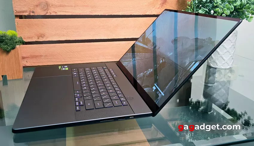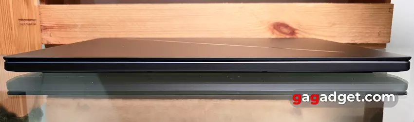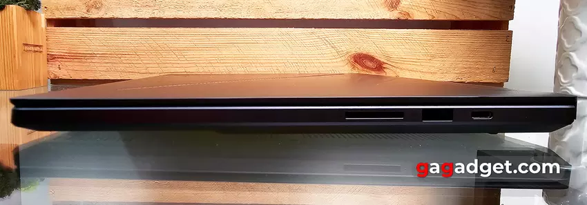 Alle aansluitingen bevinden zich aan de zijkant, de achterkant is gereserveerd voor koeling. Aan de linkerkant heeft de laptop een bijgewerkte eigen rechthoekige voedingsaansluiting, HDMI 2.1 FRL video-uitgang, Thunderbolt 4 (met DisplayPort ondersteuning voor geïntegreerde graphics en 100W Power Delivery), full-size USB Type-A 3.2 Gen 2, evenals een 3,5 mm audio-aansluiting.
