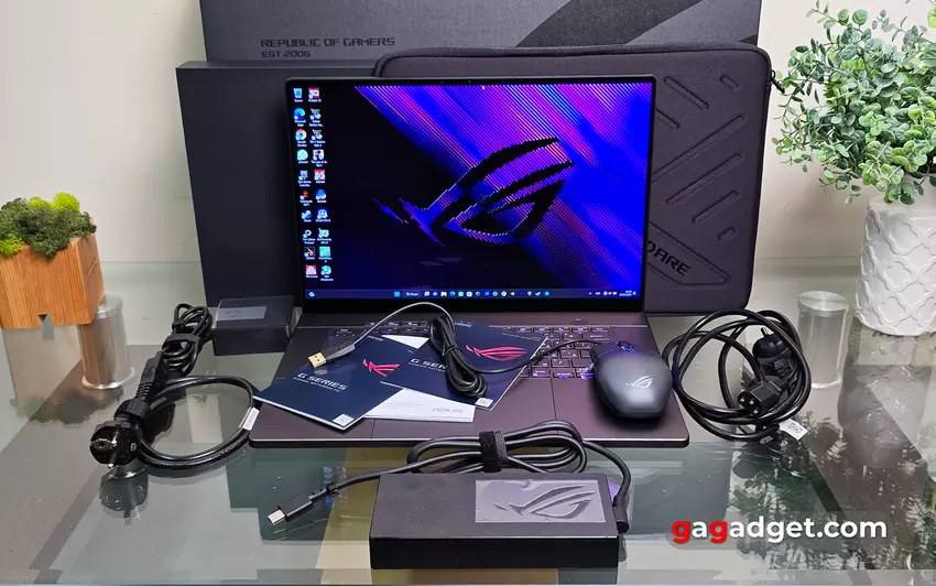 De uitstekende uitrusting van topklasse ASUS laptops is al lang geen verrassing meer, dus de grote doos van de ASUS ROG Zephyrus G16 (2024) met een heleboel interessante dingen was vrij verwacht. Naast de laptop zelf bevat het pakket een beschermhoes, een muis, een 240W hoofdvoeding, een extra 100W voeding met Type-C en documentatie. De beschermhoes is zwart. Hij heeft een interessant ontwerp en vrij dikke zachte wanden die de laptop goed beschermen. Wat vooral prettig is, is dat we al in een tijd leven waarin een krachtige 16-inch laptop in een beschermende hoes gemakkelijk in een standaard laptopvak in een rugzak past.