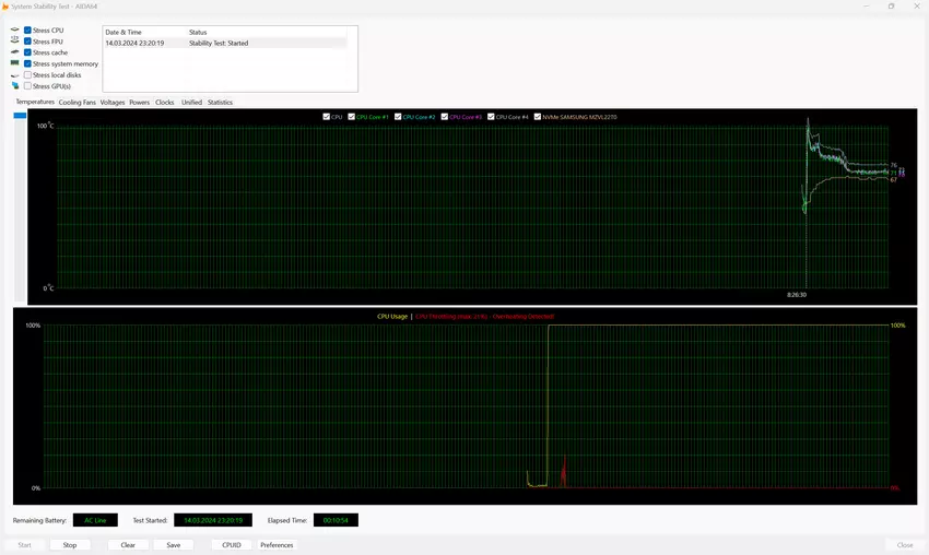 Uit de AIDA64-stresstest bleek dat de componenten bij maximale belasting aanvankelijk opwarmen tot 105° en dat er rond 20% throttling optreedt. Daarna blijft de temperatuur binnen het bereik van 75-80° en werkt de laptop stabiel. Het geluidsniveau bij maximale belasting is meer dan acceptabel, standaard zijn andere modellen meestal luider. Op sommige momenten, wanneer er geen belasting is, schakelt het koelsysteem over naar de passieve modus, hoewel dit zelden voorkomt. Het toetsenbord en het overgrote deel van het werkoppervlak blijven koel onder belasting doordat een deel van de koude lucht via het toetsenbord wordt aangezogen.