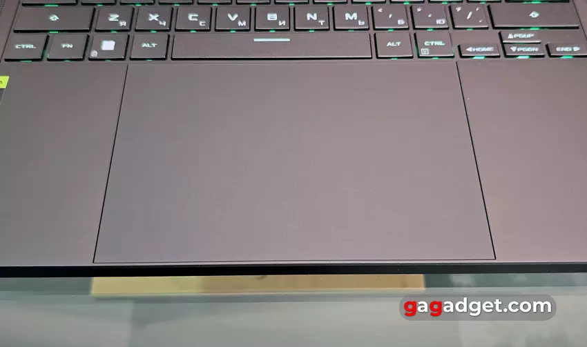 Het touchpad van de laptop is apart het vermelden waard. Het is enorm, meet 150,3 x 98,8 mm en heeft een glazen coating. De gevoeligheid en positioneringsnauwkeurigheid zijn uitstekend. Natuurlijk kun je alleen turn-based strategieën of RPG's spelen op het touchpad. Maar voor alles behalve gamen is het touchpad absoluut voldoende.