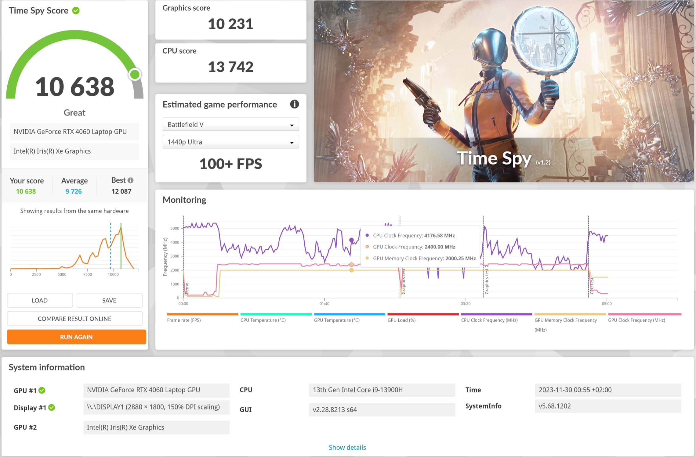 Ondanks de positionering van de laptop als krachtig werkinstrument, zijn de prestaties goed genoeg om moderne games te spelen. Het is verstandig om te gamen in 1920x1200 in plaats van native resolutie. Alan Wake 2 met hoge grafische instellingen, lage ray tracing instellingen, DLSS in balansmodus en Frame Generation draait op 50-60 FPS. Starfield op medium instellingen, DLSS in balansmodus en Frame Generation laat 70-80 FPS zien in open locaties en tot 120 in gesloten locaties. Baldur's Gate 3 op native resolutie, ultra-instellingen met DLSS in kwaliteitsmodus draait iets meer dan 70 FPS.