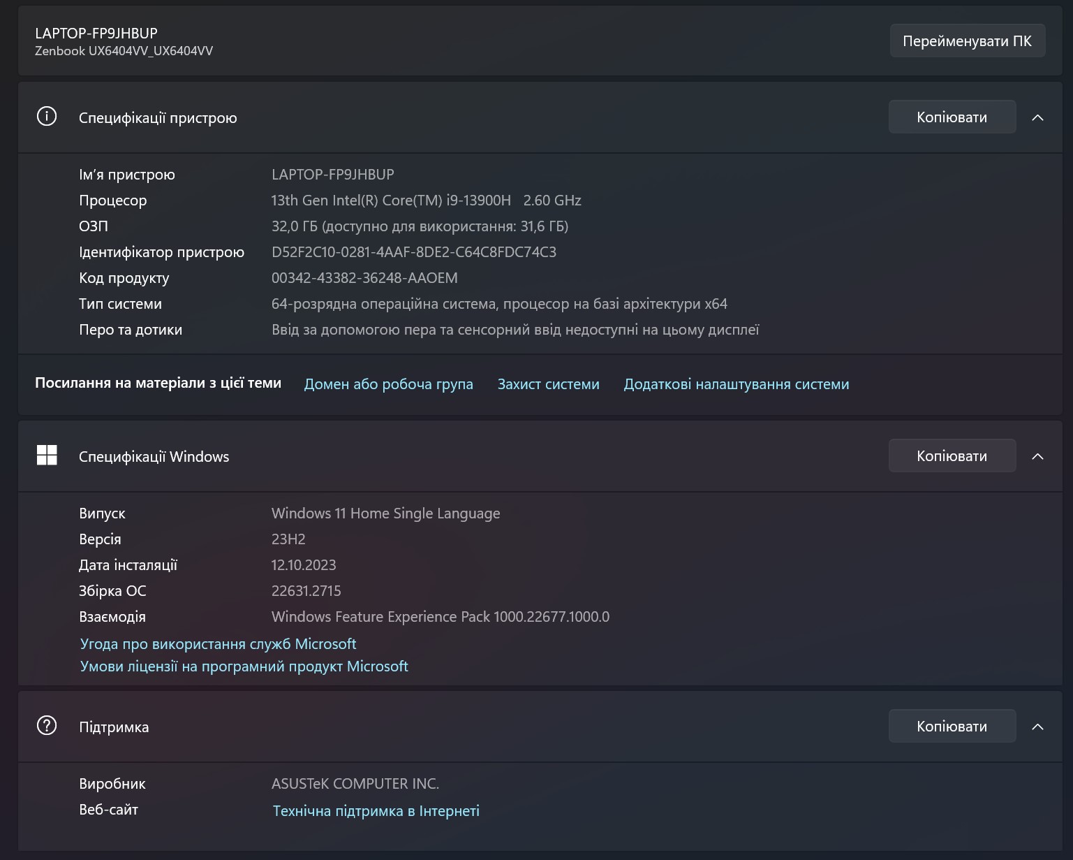 En dan nu het meest interessante deel. ASUS is erin geslaagd om zeer productieve componenten in een compacte en dunne behuizing te proppen. De processor is de top-of-the-line Intel Core i9-13900H. Deze is gemaakt met behulp van het Intel 7-proces en bevat 14 kernen. 6 productieve cores met een klokfrequentie van 2,6 tot 5,4 GHz en 8 energiezuinige cores met een klokfrequentie van 1,9 tot 4,1 GHz. Er worden maximaal 20 threads ondersteund en de cache is 24 MB. Het standaard TDP-niveau dat Intel heeft opgegeven is 45 W. En het totale TDP-niveau voor de processor en videokaart in de ASUS Zenbook Pro 14 OLED (UX6404) is 105 watt. Er is een geïntegreerde Intel Iris Xe grafische kaart met een frequentie tot 1,5 GHz. Het RAM is 32 GB DDR5-4800 (2x16 GB), werkt in dual-channel modus. De laptop ondersteunt maximaal 48 GB: 16 GB gesoldeerd en nog eens 16 GB in de sleuf. Het slot kan worden vervangen door een kaart van 32 GB. Draadloze interfaces Bluetooth 5.2 en snelle Wi-Fi 6E (802.11ax) (Dual band) 2x2. De gebruikte discrete grafische kaart is NVIDIA GeForce RTX 4060 Laptop met 8 GB GDDR6-videogeheugen. De basisfrequentie is 1140 MHz met de mogelijkheid tot versnelling tot 1470 MHz. Net als moderne gamingmodellen is de laptop uitgerust met een MUX Switch multiplexer, waarmee je een discrete grafische kaart kunt aansluiten op het beeldscherm en de ingebouwde grafische kaart kunt omzeilen. Dit vermindert de latentie en verhoogt de prestaties lichtjes.