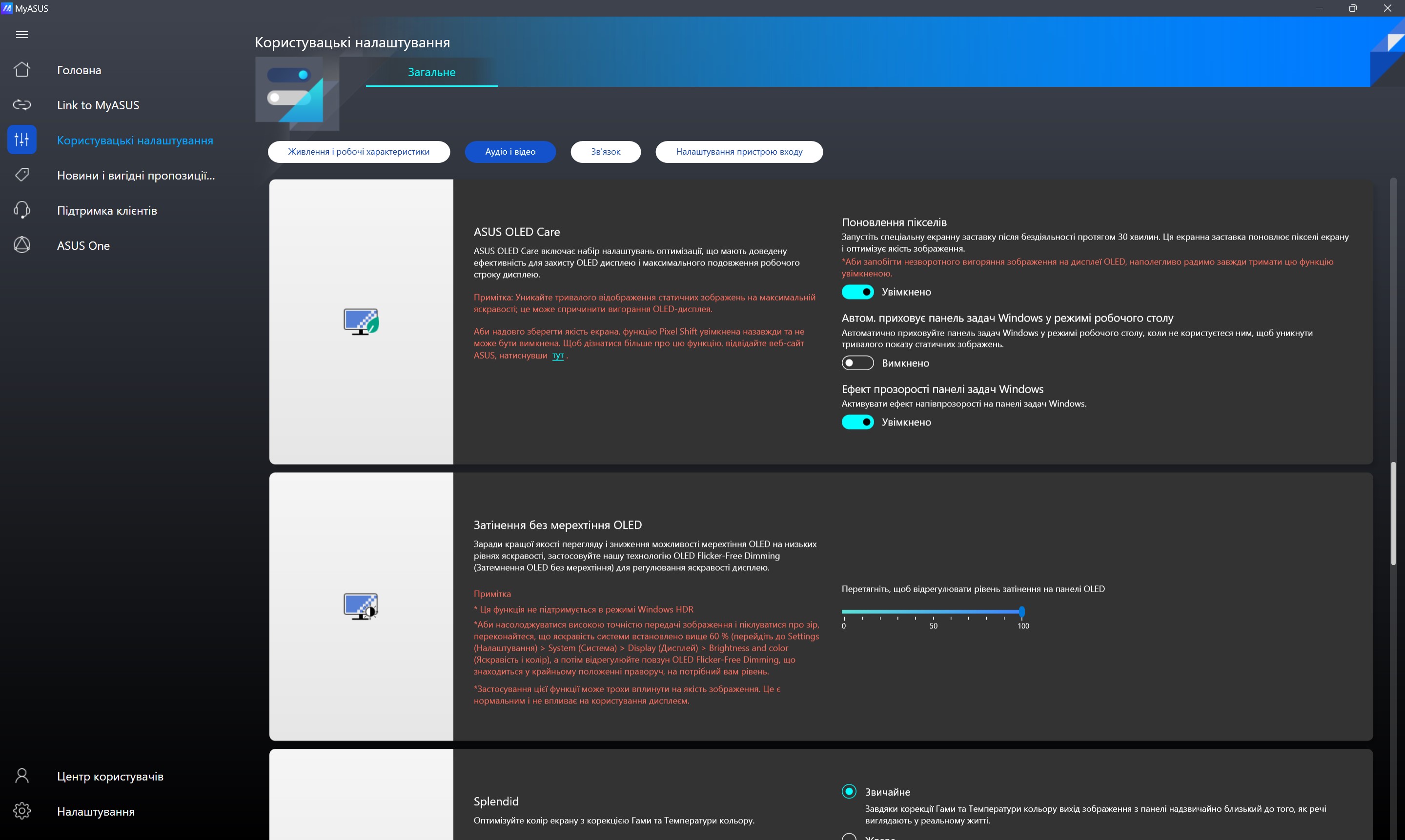 Op de laptop zijn verschillende eigen applicaties geïnstalleerd. MyASUS is de belangrijkste, die in alle laptops van het bedrijf wordt gebruikt. Het is verantwoordelijk voor de meeste instellingen. Updates, bedrijfsmodi, ruisonderdrukking, luidsprekers, enzovoort: