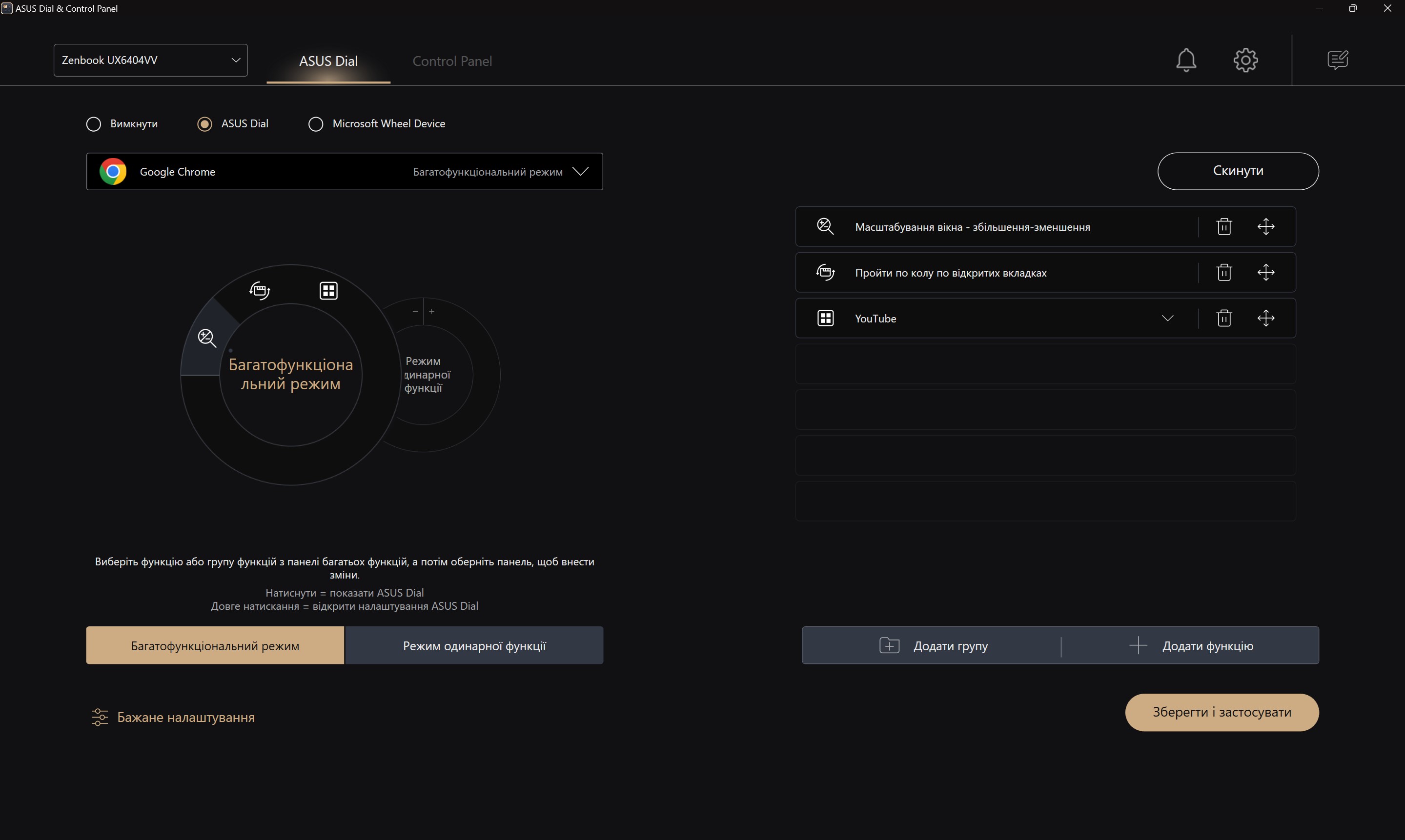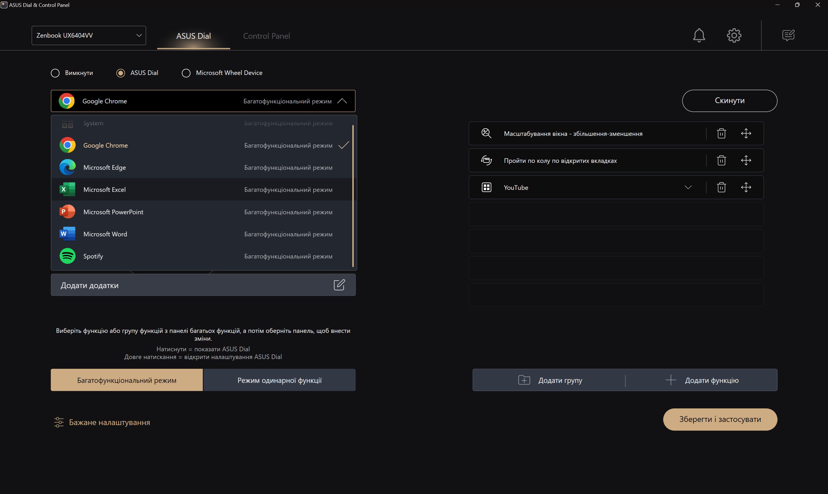Met de eigen ProArt Creator Hub toepassing kunt u de functionaliteit van de DialPad aanzienlijk uitbreiden en bepaalde functies binden aan een toepassing. Bijvoorbeeld scrollen in een browser, terugspoelen op YouTube, enzovoort. Vermeldenswaard is dat er kant-en-klare presets zijn voor een aantal belangrijke Adobe-editors: Photoshop, Illustrator, After Effects, Premiere Pro, Lightroom. Er is ook ondersteuning voor het Microsoft Surface Dial-apparaat, ze kunnen samenwerken met DialPad.