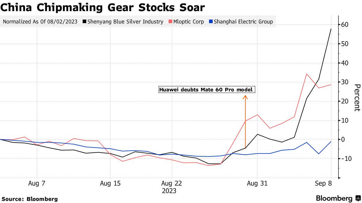 Aandelen van Chinese bedrijven gingen omhoog nadat Amerikaanse autoriteiten een onderzoek waren gestart naar de herkomst van de 7 nm Kirin 9000S-chip in Huawei-smartphones.