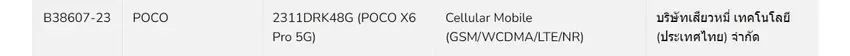De nieuwigheid met het modelnummer 2311DRK48G is opgemerkt in de database van de certificeringsinstantie NBTC. Wat interessant is, het apparaat passeert met een andere naam - POCO X6 Pro, in plaats van Redmi K70E. Dat wil zeggen dat de smartphone buiten China deel gaat uitmaken van de POCO smartphone line-up.