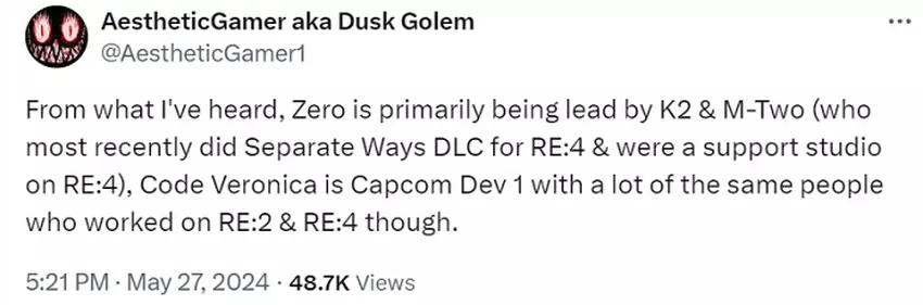 Hij deelde echter wel positief nieuws: volgens zijn informatie is Capcom bezig met de ontwikkeling van remakes van Resident Evil Zero en Code Veronica, waar fans van de serie al lange tijd om vragen.