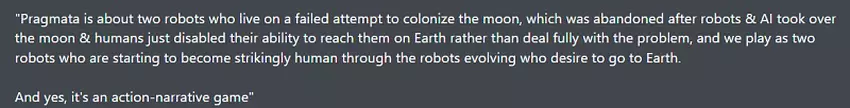 Volgens de gezaghebbende insider Dusk Golem in zijn Discord-kanaal zal het plot van Pragmata gaan over twee robots die vastzitten op een maankolonie en terug willen keren naar de aarde, maar niemand wacht daar op hen.