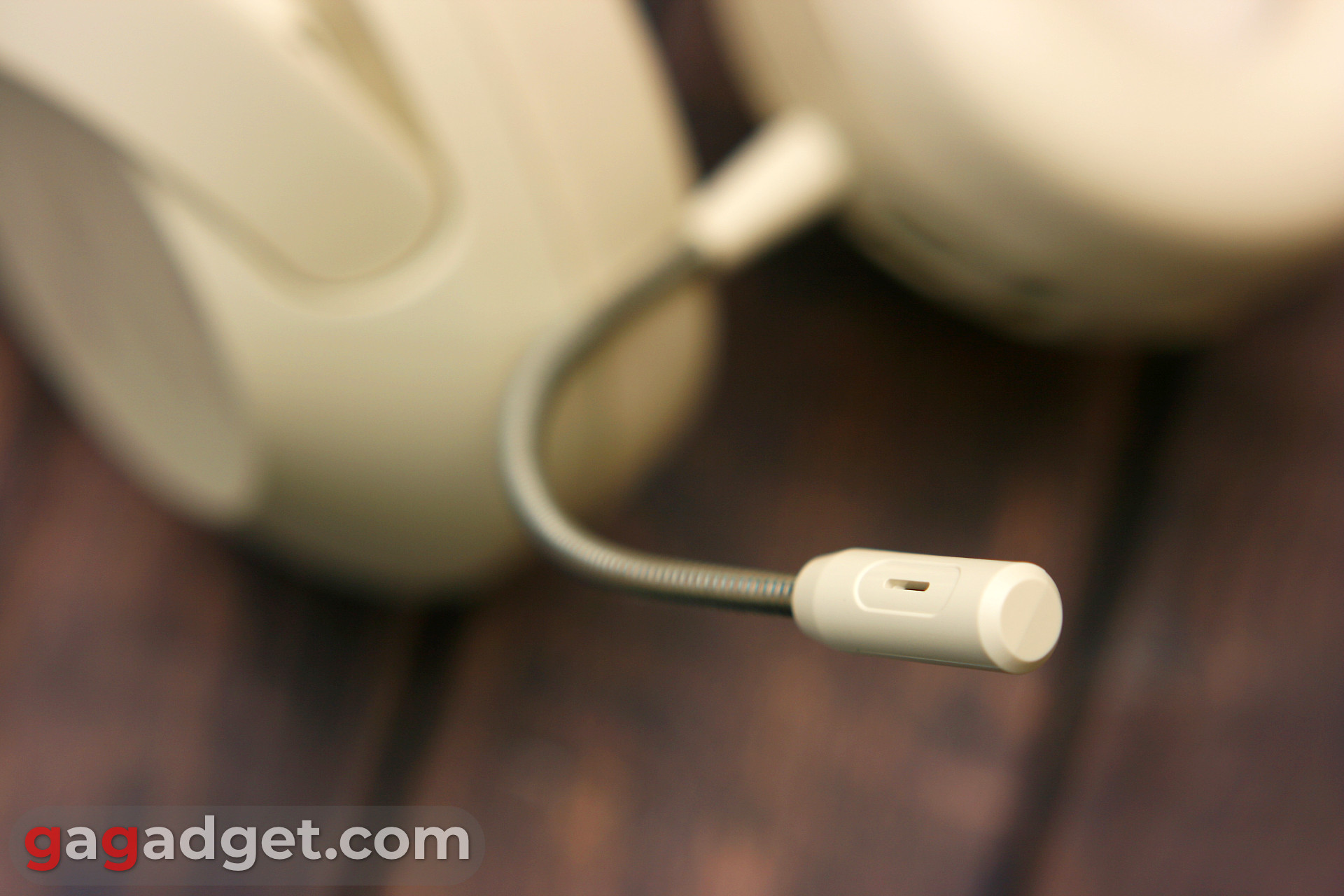 De afneembare microfoon heeft een 10 centimeter lange flexibele chromen poot, die je naar wens kunt buigen en draaien. Voor de aansluiting wordt een driepins "micro jack" met een diameter van 2,5 mm gebruikt. Dit is niet de meest gebruikelijke oplossing, dus als je een microfoon verliest, zal het moeilijker zijn om een vergelijkbare te vinden dan bij de meer gebruikelijke 3,5mm-aansluitingen, die meestal worden gebruikt in gamerheadsets. De poort voor de audiokabel is trouwens standaard, 3,5 mm, en de volledige kabel heeft TRRS minijacks. Dat wil zeggen, met een bedrade verbinding krijg je niet alleen een hoofdtelefoon, maar een volwaardige headset met een microfoon.