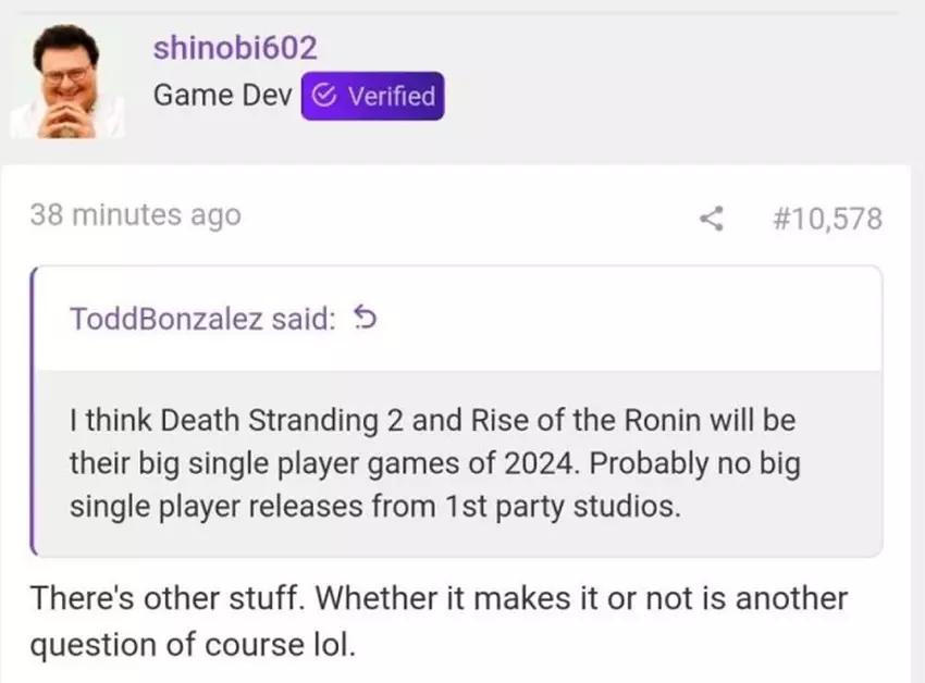Op het ResetEra forum meldde Shinobi602 dat het actiespel Rise Of The Ronin van de Japanse studio Team Ninja en Death Stranding 2, dat wordt ontwikkeld door de beroemde gameontwerper Hideo Kojima, in 2024 zullen uitkomen.