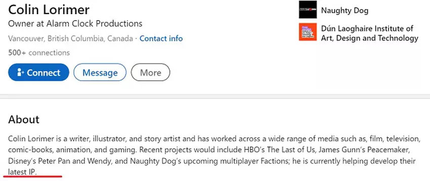 Op zijn Linkedin-pagina gaf scenarioschrijver en illustrator Colin Lorimer, eigenaar van Alarm Clock Productions, aan dat hij momenteel de Naughty Dog studio actief helpt bij de ontwikkeling van een game gebaseerd op een gloednieuw IP.