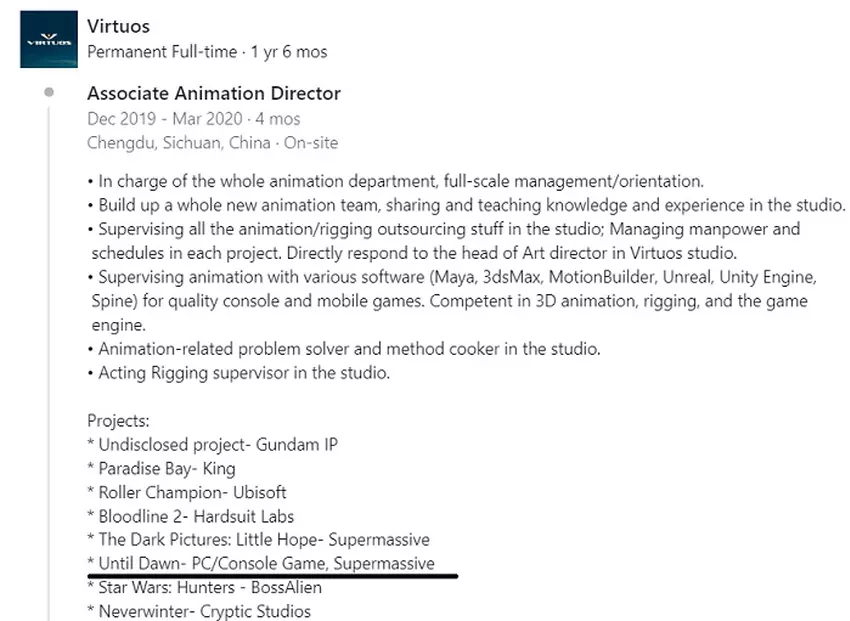 Oplettende Reddit-gebruikers vonden dat het LinkedIn-profiel van animator Naceri Lu aangeeft dat hij tussen december 2019 en maart 2020 werkte bij Virtuos Studios en een van de projecten Until Dawn aangaf, en in versies voor pc en consoles, wat bijzonder interessant is, omdat de game eerder alleen op PS4 werd uitgebracht. Dit komt volledig overeen met de woorden van billbil-kun, die zegt dat de verbeterde versie van Until Dawn niet alleen op PS5, maar ook op PC zal worden uitgebracht.