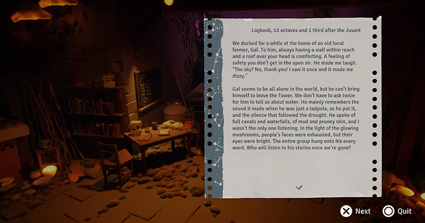 Tijdens de volledige speelduur van 5 uur hoor je geen enkele dialoog. Het hele verhaal wordt verteld door de omgeving en de notities. We zien bijvoorbeeld klimtoestellen en als we in een klein dorpje zijn, vinden we een briefje waarin wordt beschreven hoe iemand zijn weg heeft overwonnen. Of in een grot zien we een café met een neonbord, tafels en een koffiezetapparaat. We nemen aan dat de inwoners hier graag hun tijd doorbrachten. En zo gaat de hele walkthrough. Daarom moet je geen haast hebben in Jusant. Het is beter om even te stoppen, rond te kijken, interessante voorwerpen, kamers, brieven en alles wat je helpt om deze mysterieuze plek, die fascineert en niet loslaat, beter te begrijpen.