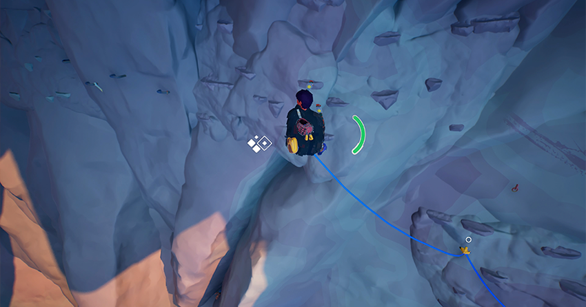 Jusant heeft een interessante implementatie van klimmen. We moeten bijvoorbeeld 100 meter hoger klimmen. We naderen de berg, de held zet het touw vast en de klim begint. Om je aan de richels vast te houden, moet je L2 op het gamepad gebruiken, dat verantwoordelijk is voor de linkerhand, en R2, dat verantwoordelijk is voor de rechterhand. En zo gaan we omhoog, waarbij we de twee knoppen gebruiken en de richting aanwijzen met de stick. Als je de volgende richel niet kunt bereiken, moet je springen, maar het is belangrijk dat je alles goed berekent zodat je niet valt. Als je te hoog bent geklommen en bang bent dat de manoeuvre mislukt en je valt, waardoor je het helemaal opnieuw moet doen, kun je een veiligheidsharnas bevestigen. Je kunt ze maar 4 keer bevestigen tijdens één beklimming.