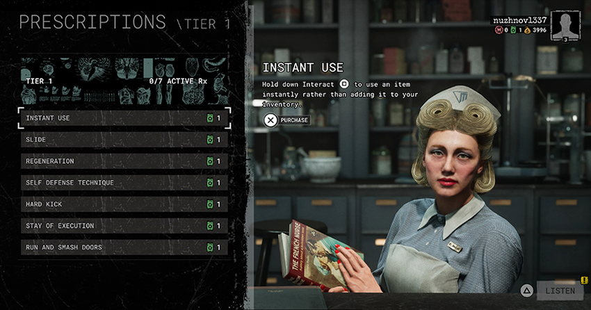 Er is ook Emily Barlow, een apothekeres die nieuwe heldenvaardigheden ontgrendelt, zoals de mogelijkheid om broodjes te maken of je inventaris te vergroten. En de laatste is Dorris. Deze vrouw verkoopt illegale amfetaminen, die erg handig zijn. Ze verkoopt bijvoorbeeld een amp waarmee je over glas kunt lopen zonder lawaai te maken. Of neem een amp die de batterij van je luchtdrukpistool geleidelijk herstelt terwijl je het niet gebruikt.
