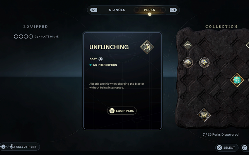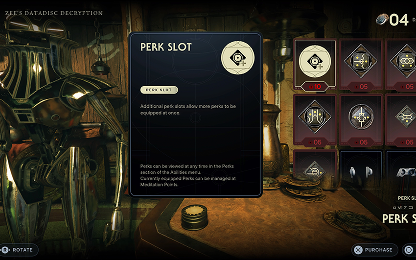 Wat zijn deze perks? Dit zijn passieve vaardigheden die je prestaties verbeteren, waardoor je bijvoorbeeld aanvallen langer kunt blokkeren of meer schade kunt toebrengen met een lichtzwaardworp. Elke perk neemt een bepaald aantal slots in beslag. Aan het begin van het spel zijn er niet veel slots beschikbaar, maar door collectibles te verzamelen kun je meer slots en nieuwe perks krijgen. Om perks te veranderen, moet je de meditatiecirkels gebruiken.