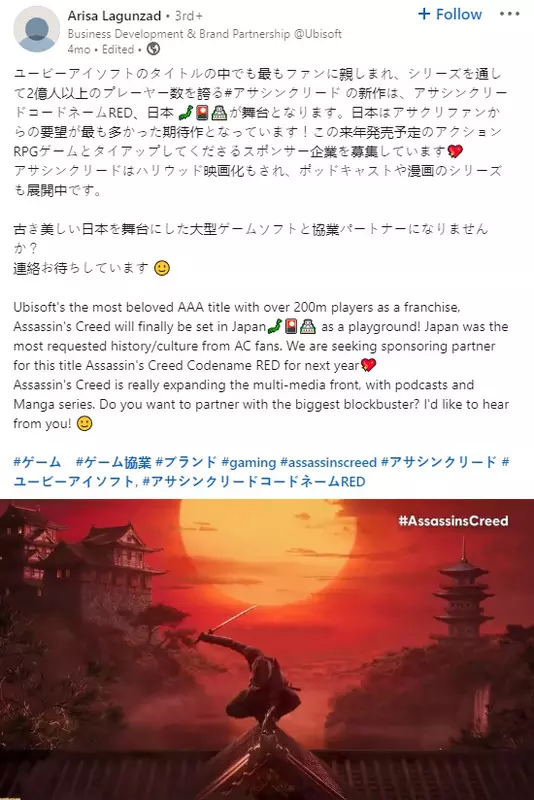 Een van de nieuwigheden wordt het langverwachte spel in de setting van het feodale Japan - Assassin's Creed Red (werktitel). Officiële informatie over dit project is nog steeds beperkt tot algemene woorden, maar het netwerk heeft aandacht besteed aan de post van Arisa Lagunzad (Arisa Lagunzad) - business development manager van Ubisoft.