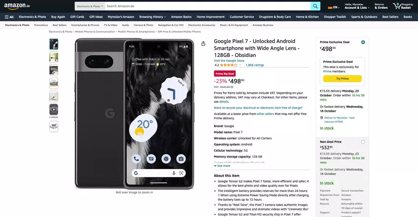 We hebben het over de Pixel 7. De smartphone is verkrijgbaar in de kleur Obsidian en kost check price on amazon. Dankzij het Prime-abonnement kan de prijs nog eens met € 35 worden verlaagd.