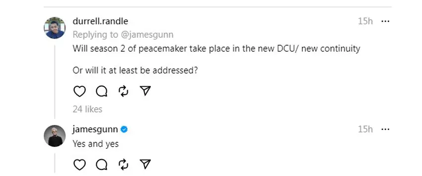 De regisseur is al bezig met het schrijven van het script voor het tweede seizoen van Peacemaker, een van de volgende projecten van DC Studios. Gunn reageerde in Threads ook op de vraag van een fan of Peacemaker deel zal uitmaken van het nieuwe DC-universum: "Ja en ja," schreef de regisseur.