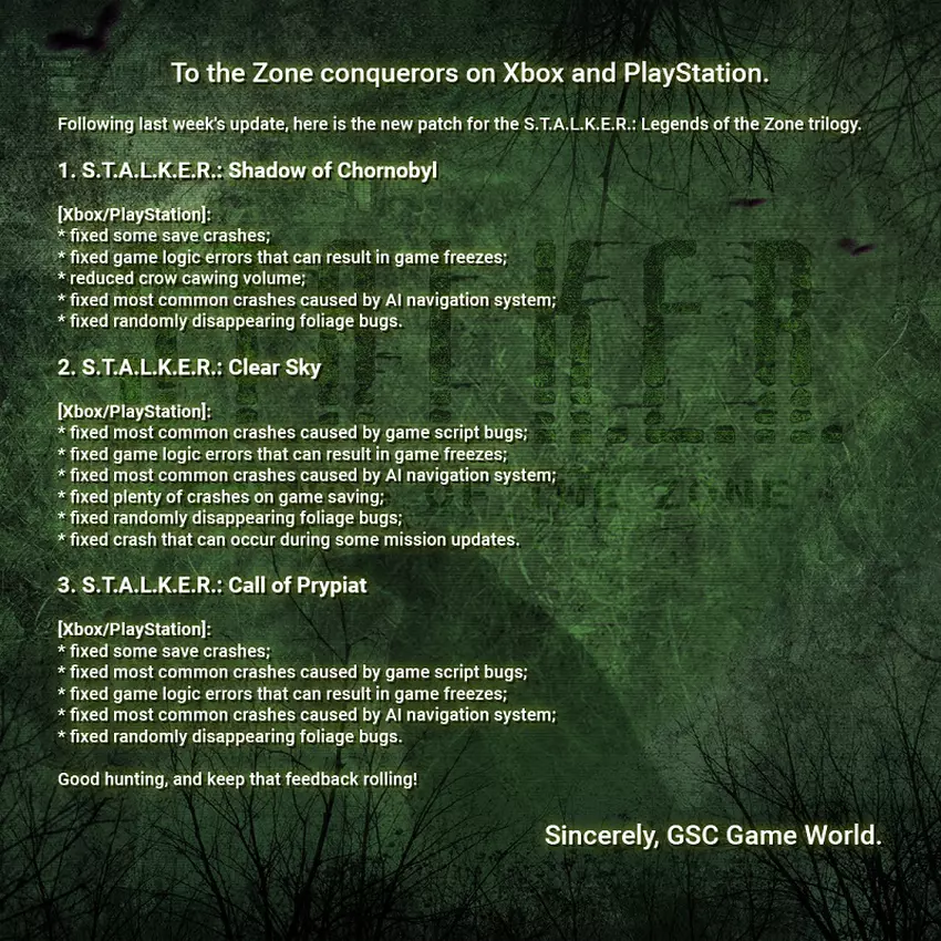De Oekraïense studio GSC Game World heeft weer een patch uitgebracht voor de compilatie S.T.A.L.K.E.R. Legends of the Zone, die sinds vorige maand verkrijgbaar is op PlayStation- en Xbox-consoles van beide huidige generaties.
