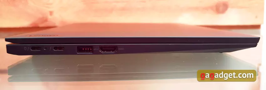 Aan de linkerkant is er een USB-C Thunderbolt 4 (ook gebruikt voor voeding), nog een USB-C Thunderbolt 4, USB-A 3.2 Gen 1 en HDMI 2.0b. RJ-45 netwerken zijn beschikbaar dankzij de meegeleverde adapter, dus misschien kan er alleen een kaartlezer worden toegevoegd.