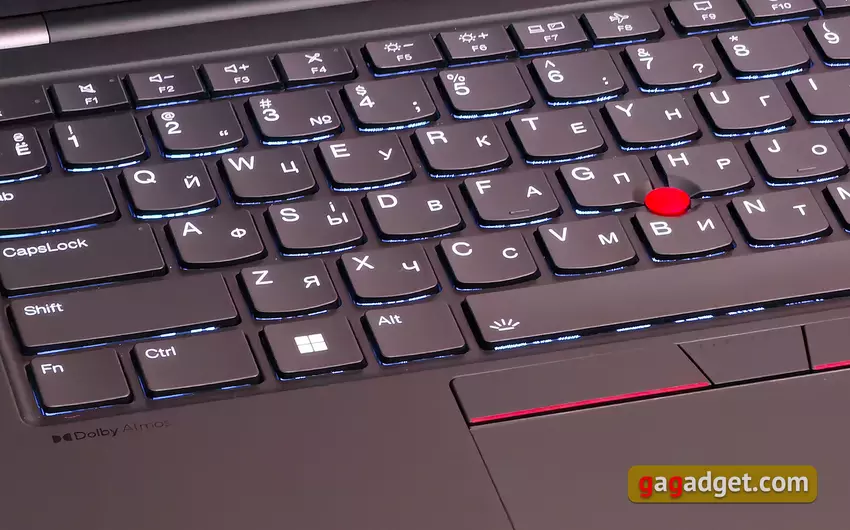 Tussen de G, H en B knoppen zit een trackpoint, traditioneel voor de ThinkPad lijn, die al tientallen jaren wordt gebruikt.