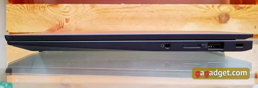 ThinkPad-modellen hebben altijd een goede set aansluitingen. De Lenovo ThinkPad X1 Carbon Gen 11 is daarop geen uitzondering. Aan de rechterkant vind je een 3,5mm audio jack, een nanoSIM slot (er zijn configuraties met en zonder mobiel modem), een USB Type-A 3.2 Gen 1 en een Kensington Nano Security Slot: