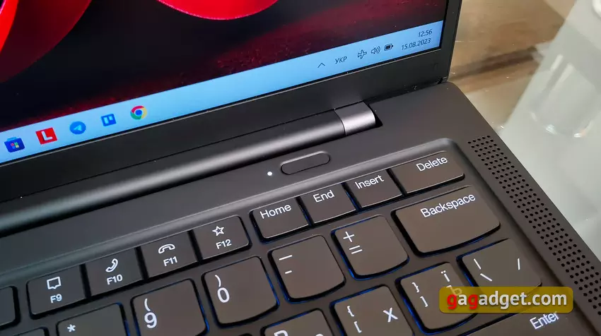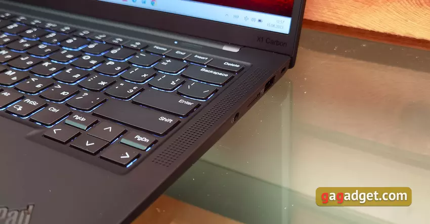 Het toetsenbord ligt iets verzonken in het werkoppervlak. Er zitten luidsprekers aan de zijkanten, hoewel dit geen invloed heeft gehad op de lay-out, het is absoluut standaard voor de Lenovo ThinkPad X1 Carbon lijn, dus alles zal vertrouwd zijn voor kenners. En voor degenen die net hebben besloten om over te stappen op ThinkPad, zullen er een paar dingen zijn om aan te wennen. Er zijn aparte knoppen Home, End en Delete aan het einde van de bovenste rij, het pijlblok is iets naar de gebruiker verschoven en de knoppen PgUp en PgDn zijn aan de zijkanten van de pijl omhoog geplaatst. PrtSc bevindt zich tussen de knoppen Alt en Ctrl rechts. En een traditionele functie: Fn en linker Ctrl zijn verwisseld. Maar dit kan worden ingesteld in de Lenovo Vantage app.