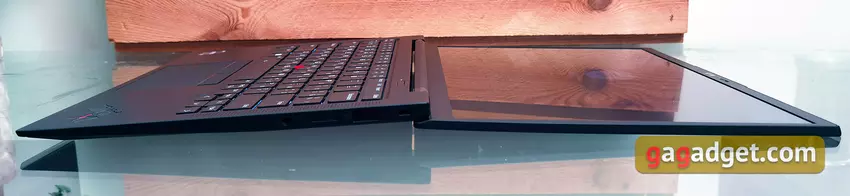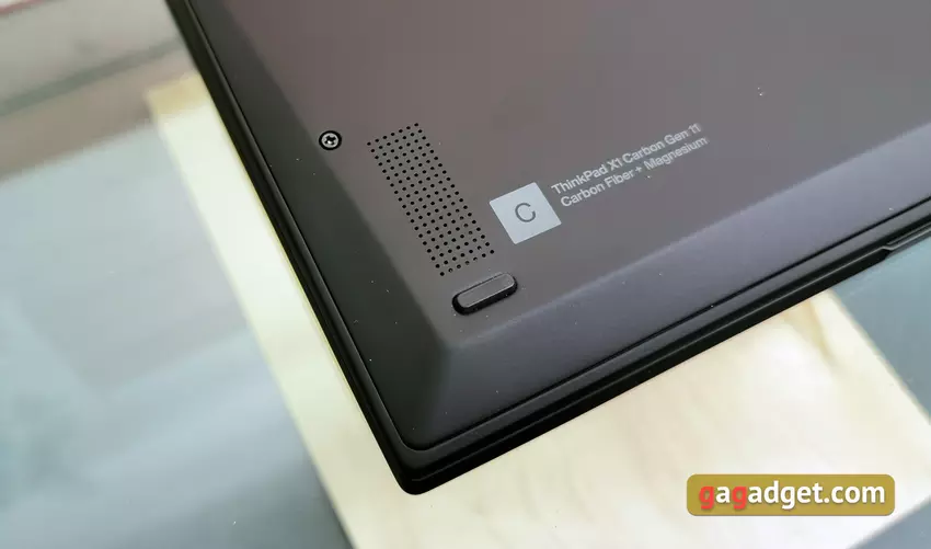 De behuizing is nog steeds gemaakt van magnesiumlegering en koolstofvezel. Dankzij deze materialen is de behuizing zeer duurzaam en licht. De laptop is verkrijgbaar in twee ontwerpopties: met een koolstofvezel textuur of een meer bekende zwarte deksel met een matte afwerking, die erg lijkt op Soft Touch. Wij hadden de laatste optie. Het oogt en voelt erg mooi, maar het verzamelt een beetje afdrukken. Er is een klein Lenovo-logo in de rechterbenedenhoek van de bovenklep en een ThinkPad-logo met een rode LED-indicator linksboven.