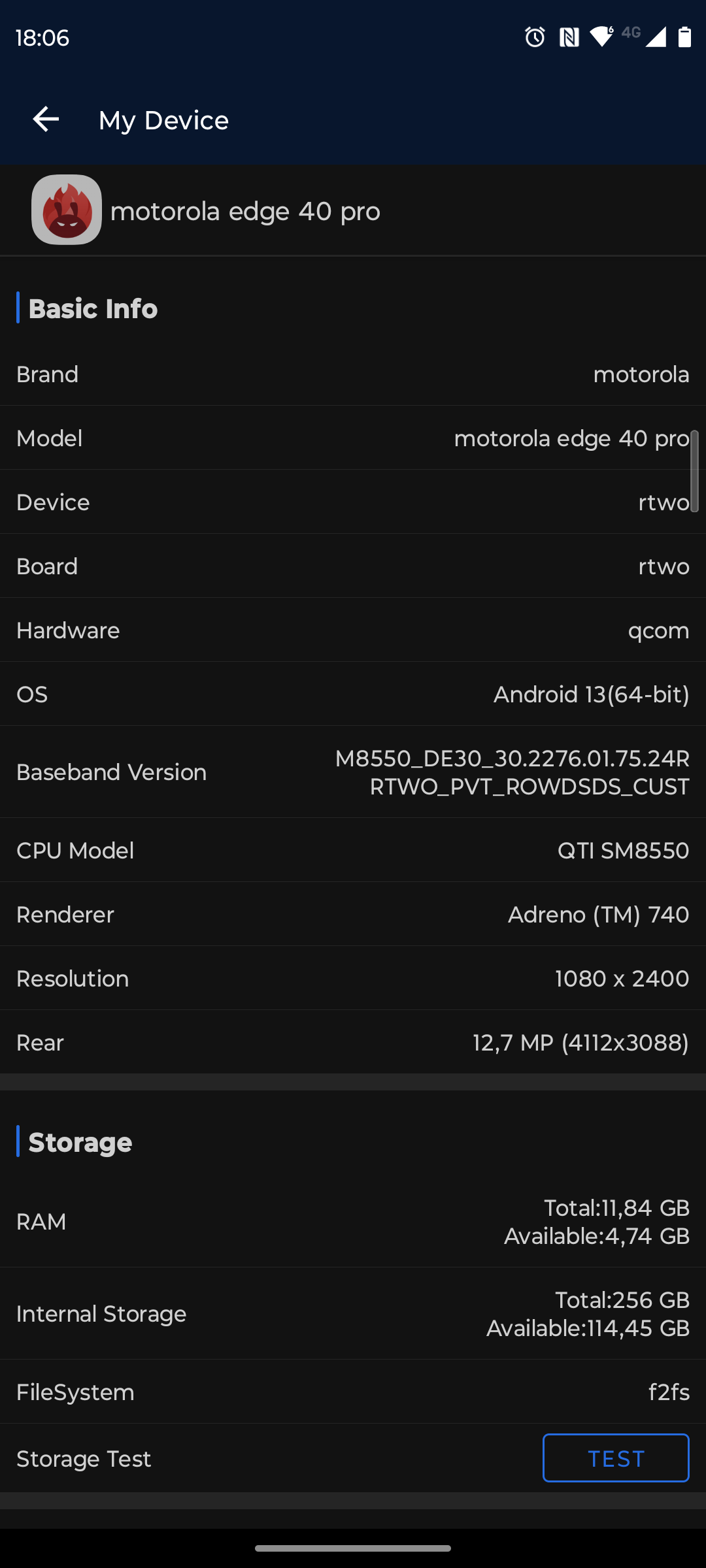 Motorola Edge 40 Pro is uitgerust met de nieuwste paradepaardjes. Binnenin zit de top-end Qualcomm Snapdragon 8 Gen 2 processor. Deze is gemaakt op een 4nm procestechnologie en bevat 8 kernen in een 1+2+2+3 configuratie: 1xARM Cortex-X3 op 3,19 GHz, 2xCortex-A715 op 2,8 GHz, 2xCortex-A710 op 2,8 GHz en 3xCortex-A510 op 2 GHz. De grafische voorzieningen worden verzorgd door de Adreno 740 versneller. Het RAM-geheugen is 12 GB LPDDR5X. De interne opslag heeft een capaciteit van 256 GB en maakt gebruik van de nieuwe snelle standaard UFS 4.0. Daarom is de Motorola Edge 40 Pro een van de krachtigste processors van dit moment, wat wordt bevestigd door de resultaten in prestatietests.