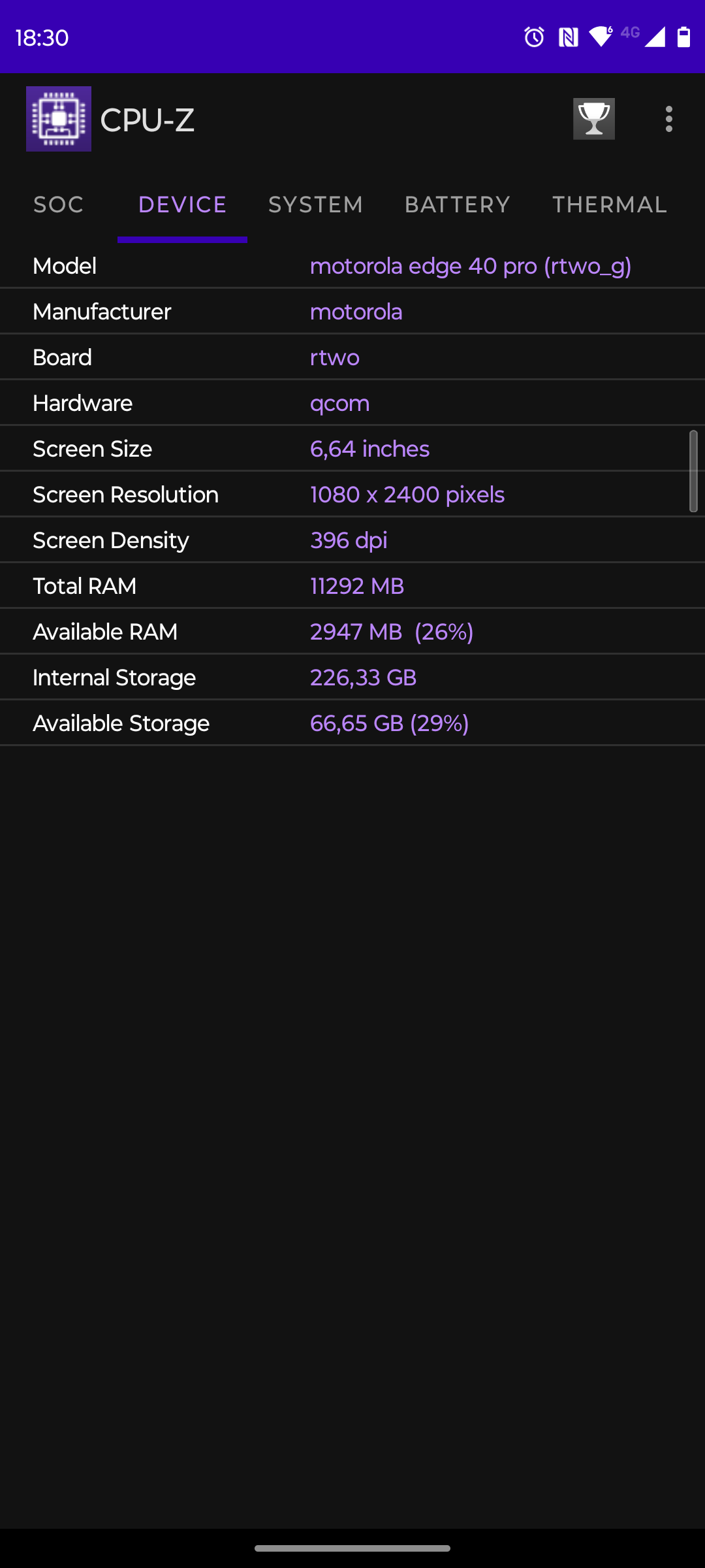 Motorola Edge 40 Pro heeft een 6,67-inch pOLED met rondingen aan de zijkanten. Deresolutie is 2400x1080 (beeldverhouding 20:9) en de pixeldichtheid is ongeveer 394 ppi. Er wordt een 10-bits matrix gebruikt die meer dan een miljard kleurschakeringen kan weergeven. Het belooft een DCI-P3 kleurengamma en een piekhelderheid van 1300 cd/m² in automatische modus. Er is ondersteuning voor HDR10+ en Dolby Vision. Opmerkelijk is dat de maximale verversingssnelheid 165Hz is. Dit is hoger dan de meeste vlaggenschip smartphones. Er zijn modi van 60, 120, 165 Hz, maar ook een adaptieve modus, waarbij de frequentie automatisch wordt aangepast in het bereik tot 120 Hz. De uitleesfrequentie van de sensor is 360 Hz, wat belangrijk is voor wie graag games speelt op zijn smartphone. Er is vrij veel in de instellingen. Helderheid, donkere en lichte thema's, interface en tekstschaal, flikkerpreventie (DC Dimming) voor de PWM-getuigde secte, vernieuwingsfrequentie, nachtmodus, schermverlichting voor meldingen en modi voor kleurweergave (helder en natuurlijk) met aanpassing van de kleurtemperatuur.