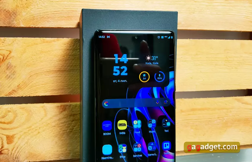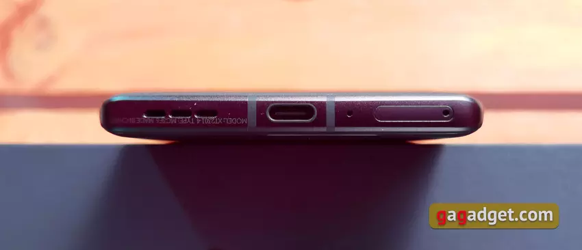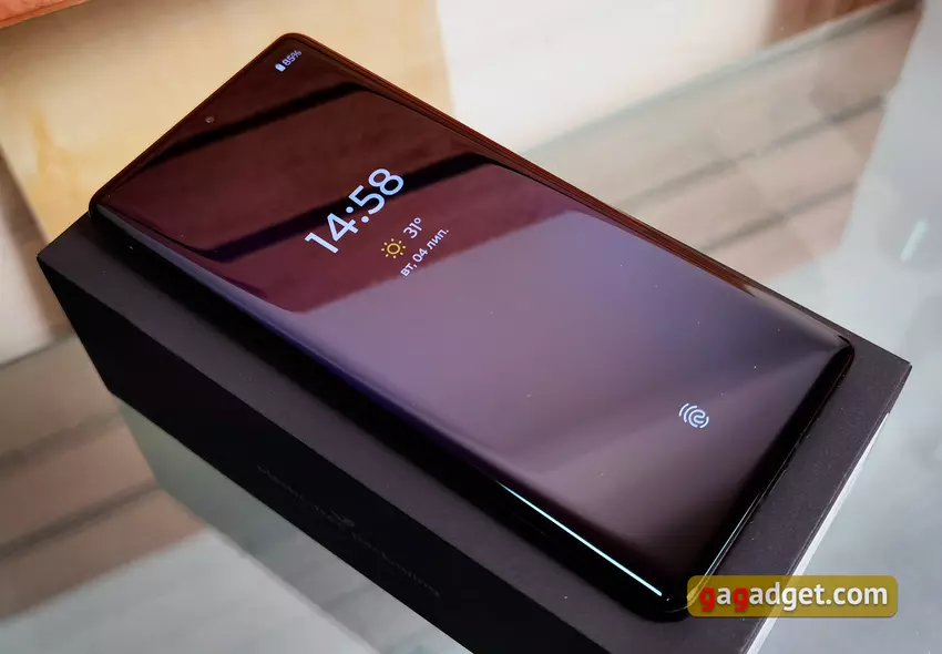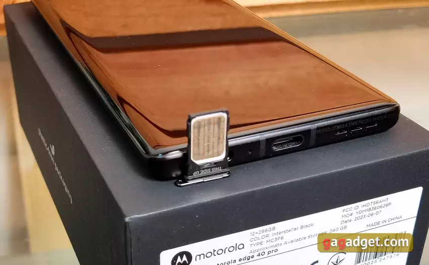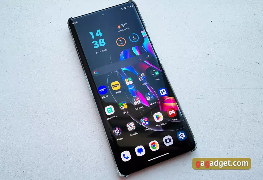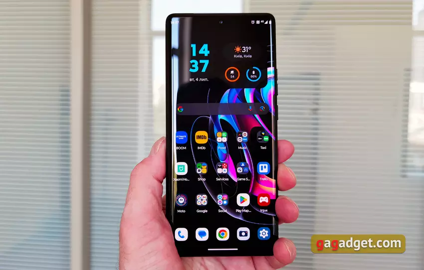 De behuizing van de Motorola Edge 40 Pro is gemaakt van glas en metaal, zoals alle huidige vlaggenschepen. De voor- en achterkant van de smartphone zijn voorzien van Gorilla Glass Victus. Het scherm neemt bijna de hele voorkant van de smartphone in beslag: de randen zijn erg dun en de bochten dragen bij aan het "randloze" effect. We zijn gewend dat meestal alleen de zijkanten van het scherm gebogen zijn. In dit geval zijn er ook bochten aan de boven- en onderkant. Het ziet er geweldig uit, het lijkt erop dat het scherm vloeiend overgaat in de zijranden. Er zijn gebruikers die niet van gebogen schermen houden. Dit is iets heel subjectiefs. Maar objectief gezien waren er geen valse klikken tijdens het gebruik. De camera aan de voorkant zit traditioneel in een rond gat aan de bovenkant van het scherm. Boven het scherm zit een dunne gleuf voor de luidspreker van het oortje.
