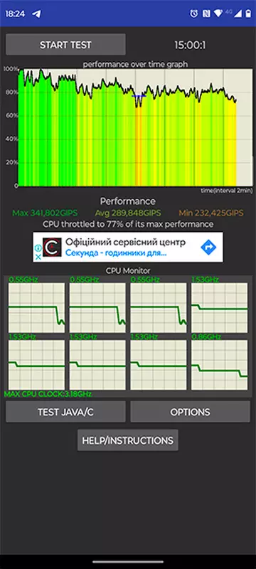 Maar de stabiliteit is niet erg goed. Bij maximale belasting in de CPU Throttling Test dalen de prestaties tot 77% in 15 minuten. Tegelijkertijd wordt de behuizing merkbaar warm. Hoewel het gezien de aanzienlijke prestatiemarge onmogelijk is om de processor zo zwaar te belasten bij echte taken. Na 10 minuten Diablo Immortal te hebben gespeeld, bleef de behuizing alleen warm en waren er geen problemen met de prestaties.