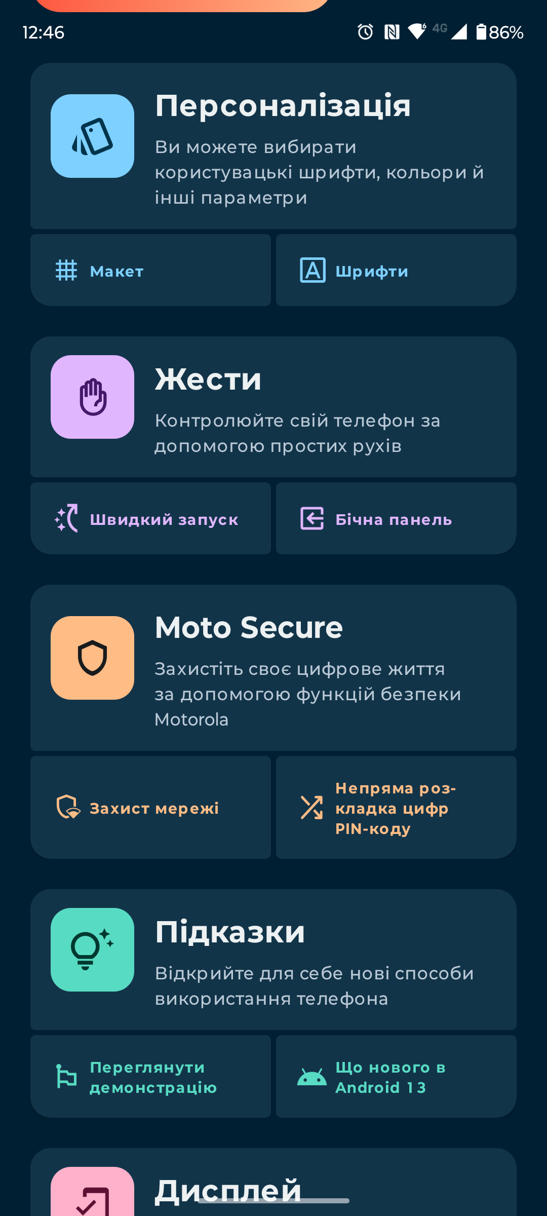 Motorola Edge 40 draait op bijna pure Android 13 zonder noemenswaardige storingen. Het werkt erg snel, zonder bugs of glitches. De interface heeft een vertrouwde structuur: desktops, widgets, een apart menu met alle applicaties, een gordijn met grote schakelaars. Er zijn veel aanpassingsmogelijkheden: kleurenschema's, lettertype, raster, achtergrond, etc.