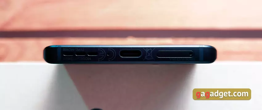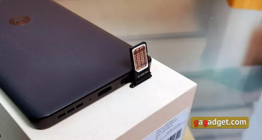 De Type-C connector bevindt zich aan de onderkant. In het vlaggenschip van de Motorola Edge 40 Pro was dit USB 3.2 en werd DisplayPort 1.4 ondersteund. In het jongere model hebben we USB 2.0. Aan de zijkanten van de poort zit een externe luidspreker, nog een microfoon en een lade.