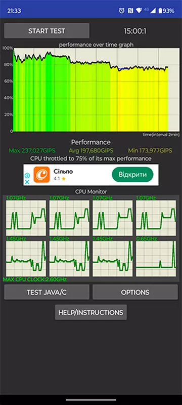 Maar de smartphone wordt een beetje warm. De CPU Throttling Test toonde aan dat de prestaties tot 75% kunnen afnemen tijdens 15 minuten maximale belasting. Bij dagelijks gebruik treedt pas na enige tijd verwarming op bij zware games. De behuizing wordt merkbaar warm na 15 minuten in Diablo Immortal.
