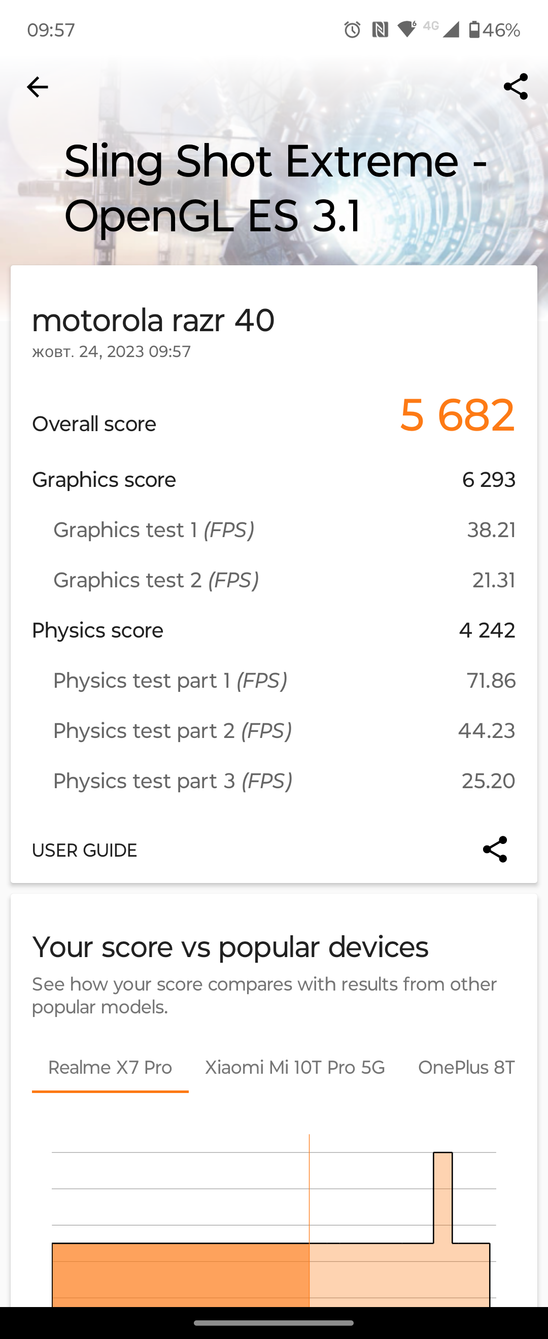De Motorola Razr 40 wordt aangedreven door de Qualcomm Snapdragon 7 Gen 1-processor, die naar huidige maatstaven nogal zwak is. Hij is gemaakt op een 4nm-procestechnologie, bevat één ARM Cortex-A710-kern met een frequentie van 2,4 GHz, nog eens drie Cortex-A710's op 2,36 GHz, vier Cortex-A510's op 1,8 GHz en een Adreno 644 grafische versneller. Het RAM-geheugen is 8 GB LPDDR4X, de opslag is 256 GB met een nogal trage UFS 2.2. Over het algemeen laat de smartphone vrij bescheiden prestaties zien in synthetische tests. Maar er zijn geen problemen bij het gebruik: de shell werkt extreem snel, applicaties blijven niet hangen en laden snel. De smartphone kan games aan, maar het is geen smartphone voor hardcore gamers die de hoogste grafische en framerate instellingen nodig hebben. Hoewel ik niet zeker weet of liefhebbers van mobiele games en potentiële Motorola Razr 40-eigenaars hetzelfde publiek vormen.