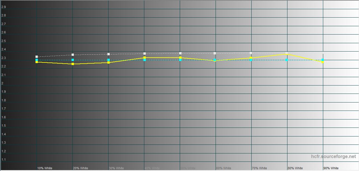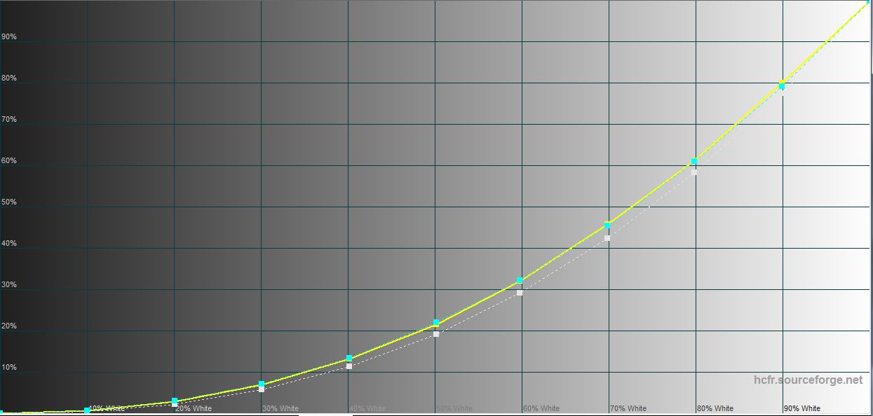In de "Natural" modus ligt het kleurengamma dicht bij sRGB en is de kleurweergave iets nauwkeuriger. Helderheid: 474.554 cd/m2.