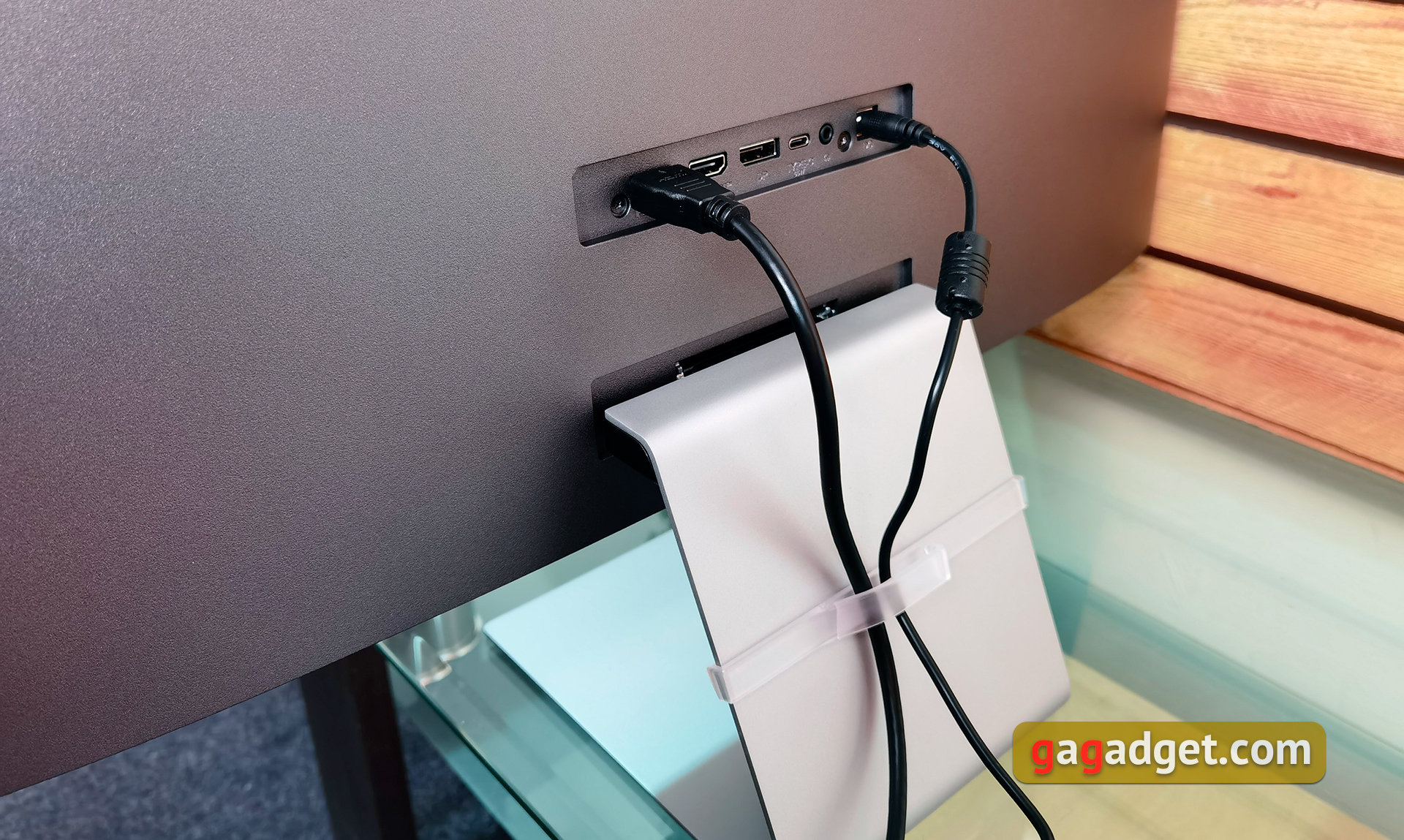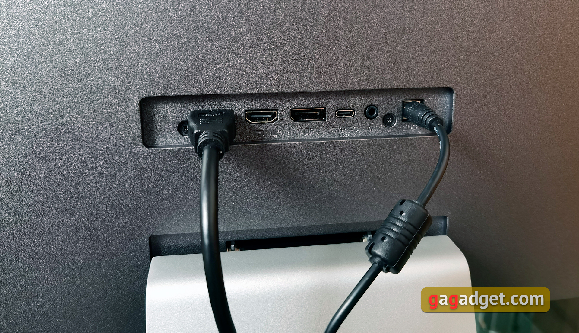 Alle aansluitingen bevinden zich in een kleine uitsparing net boven de standaard en wijzen naar achteren. Deze oplossing is erg handig als je vaak van kabel moet wisselen: je hoeft de monitor niet te verplaatsen of te kantelen.